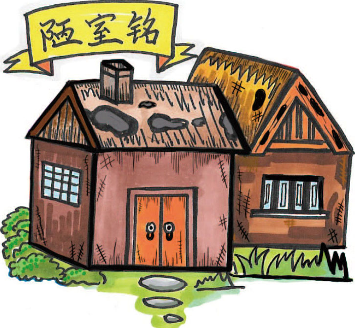 我们首先在纸张中央的位置来绘制本文的主题“陋室铭”,所以中心图画了简陋的房子,屋顶上还有几个洞。