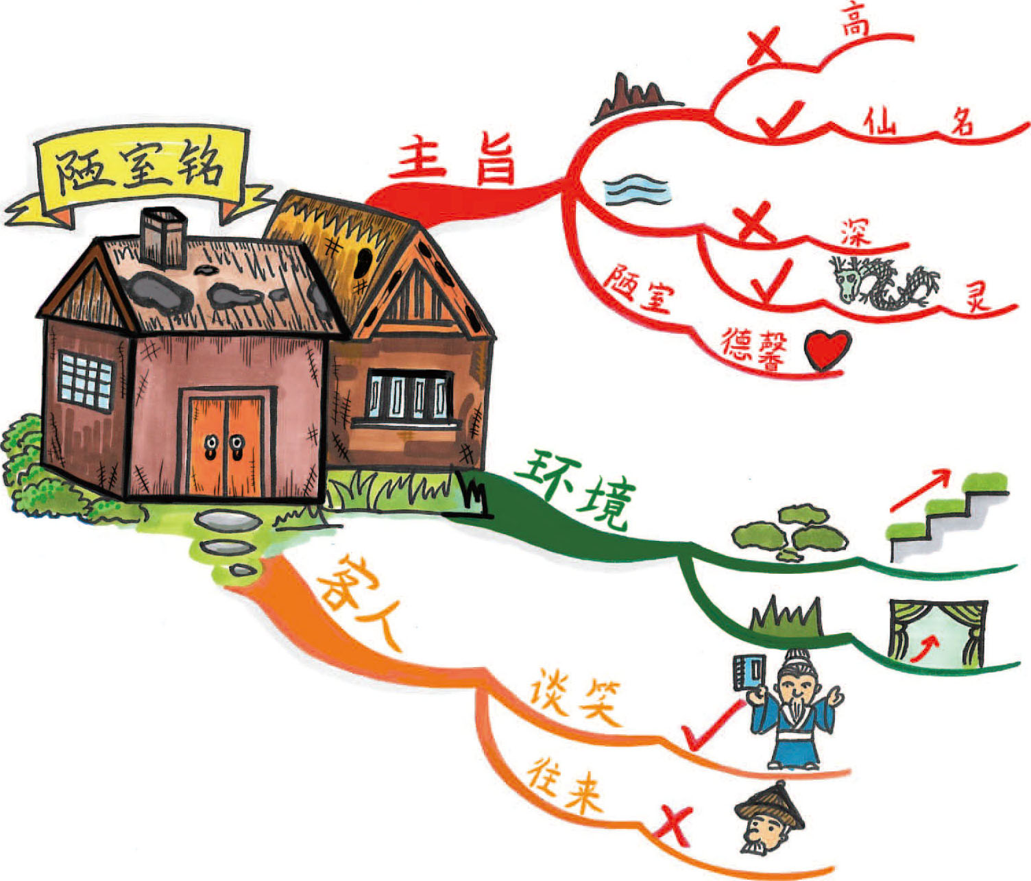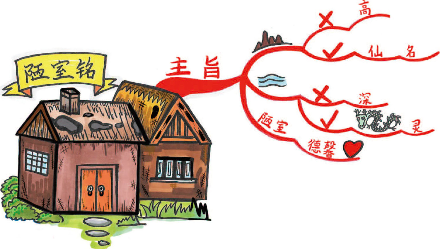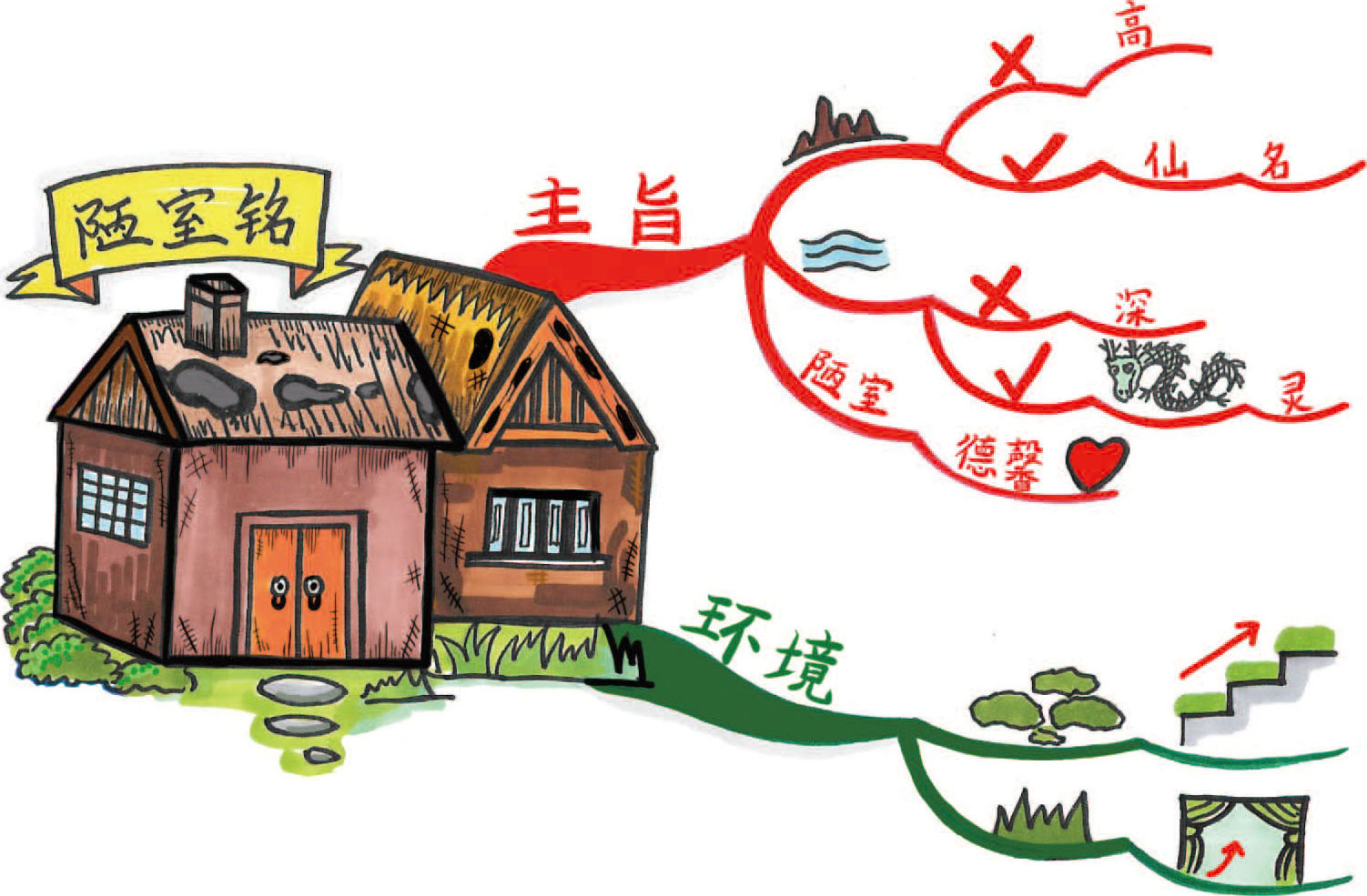主干“主旨”后面,借山水起兴,同时也作类比。山和水是并列的关系。仙,可以让并不高峻的山美名传扬;龙,可以使并不深邃的水具有灵性。“斯是陋室,惟吾德馨”是全文的主旨。“陋室”二字扣题,“德馨”一语统领全篇。“馨”谐音为“心”,所以画了一颗红心。主人高尚的品德,同样可使陋室生辉,不再简陋。