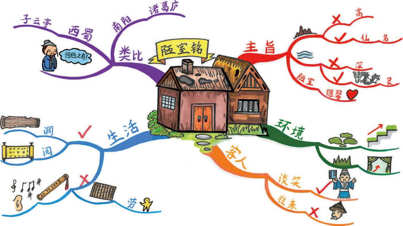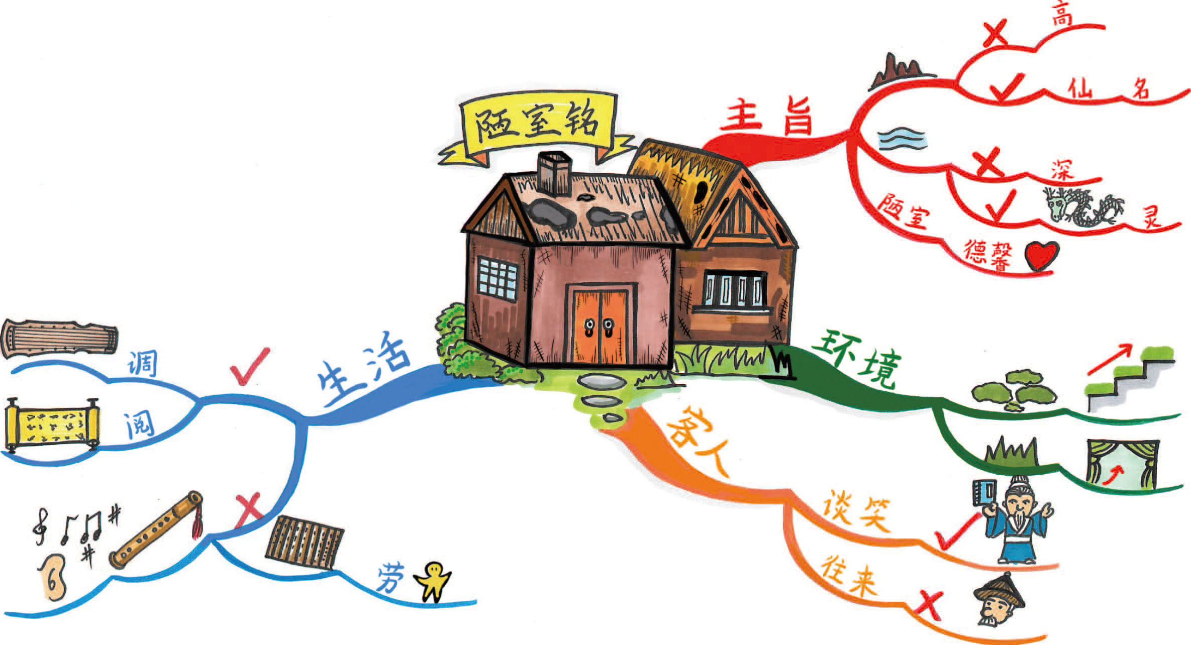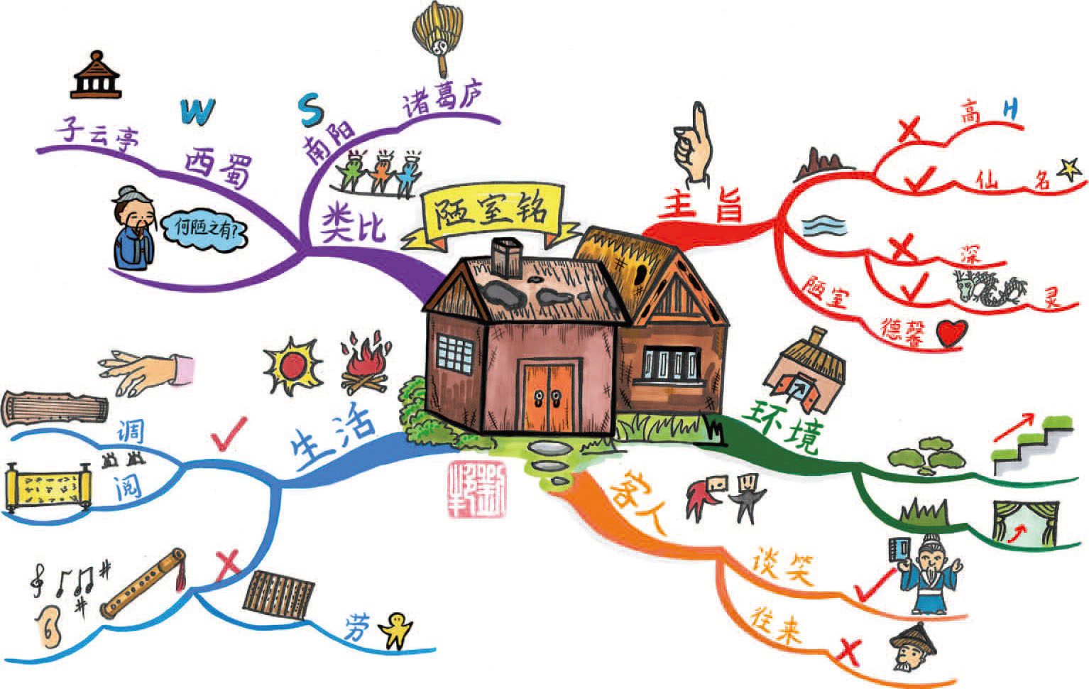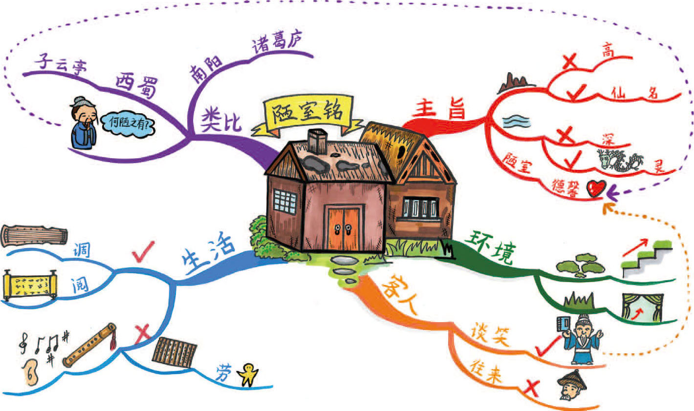 主干“主旨”后面,借山水起兴,同时也作类比。山和水是并列的关系。仙,可以让并不高峻的山美名传扬;龙,可以使并不深邃的水具有灵性。“斯是陋室,惟吾德馨”是全文的主旨。“陋室”二字扣题,“德馨”一语统领全篇。“馨”谐音为“心”,所以画了一颗红心。主人高尚的品德,同样可使陋室生辉,不再简陋。