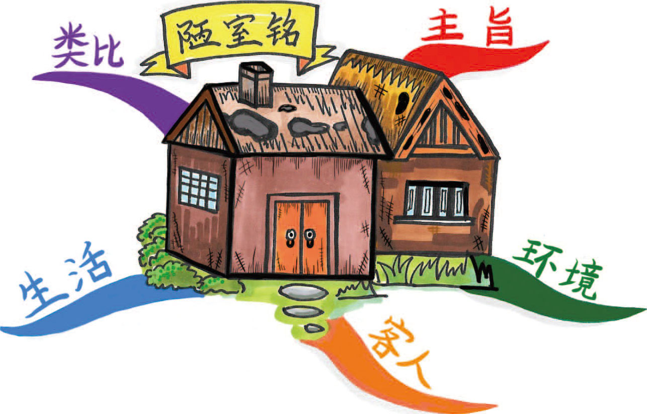 第五部分:类比。主干“类比”。先以古之名室比今之陋室,两者并论,自然得出了“陋室不陋”的结论。将自己的陋室与“诸葛庐”“子云亭”相提并论,诸葛亮身居茅屋而知天下三分之势,扬子云在简陋的亭子里写出了学术著作《太玄经》,他们虽然都曾居于陋室,最终却在功业、学术方面取得了卓越成就。最后再引用孔子之言,收束全篇,再次证明陋室不陋。孔子旁边画了一朵云,云里藏着“何陋之有?”这句孔子说的话。