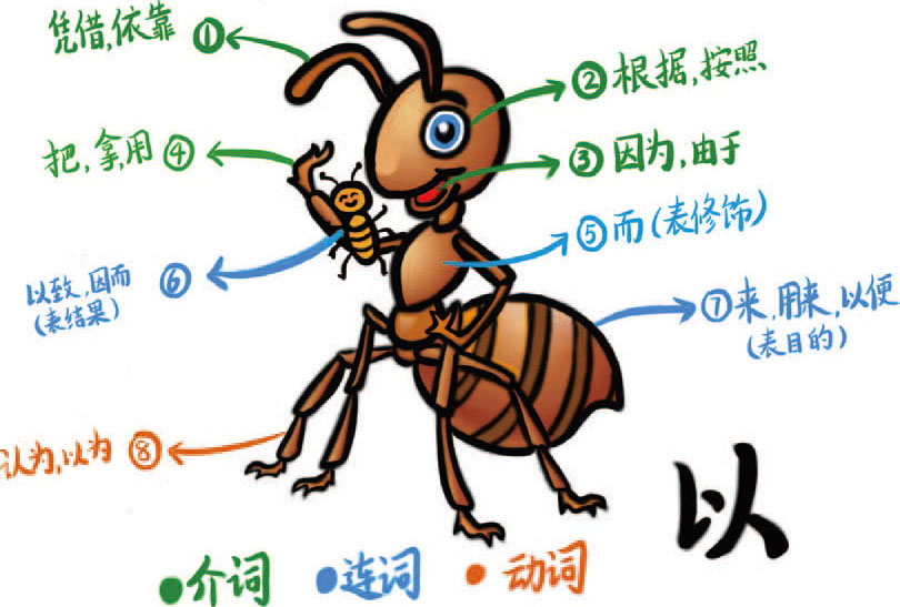 举个例子,比如说“以”,我画的图片是“蚂蚁”。“以”本身有3种词性,8个释义。我把每种词性分别赋予一种颜色:介词(绿色),连词(蓝色),动词(红色)。因为有8个释义,所以我在蚂蚁身上分别找了8个部分来对应这8个释义。最后,我们再把每个部位和对应的释义做个联结,形成一个小故事或者一个生动的画面,从而帮助你快速牢固地记下这些考点内容。