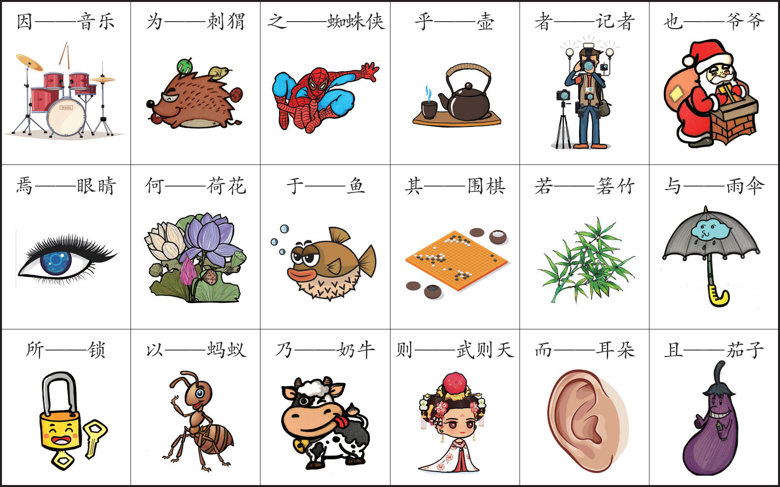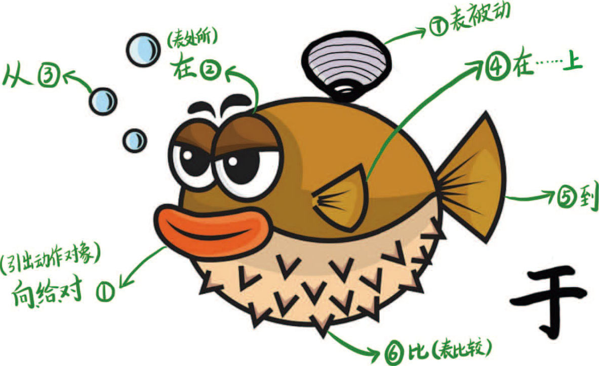 为了让你记得牢,我特意画了一些图来帮你记住这些虚词。你可不要小瞧这些图片,它们可以帮助你记下每个虚词本身包含的相关意思,而且会非常有趣。