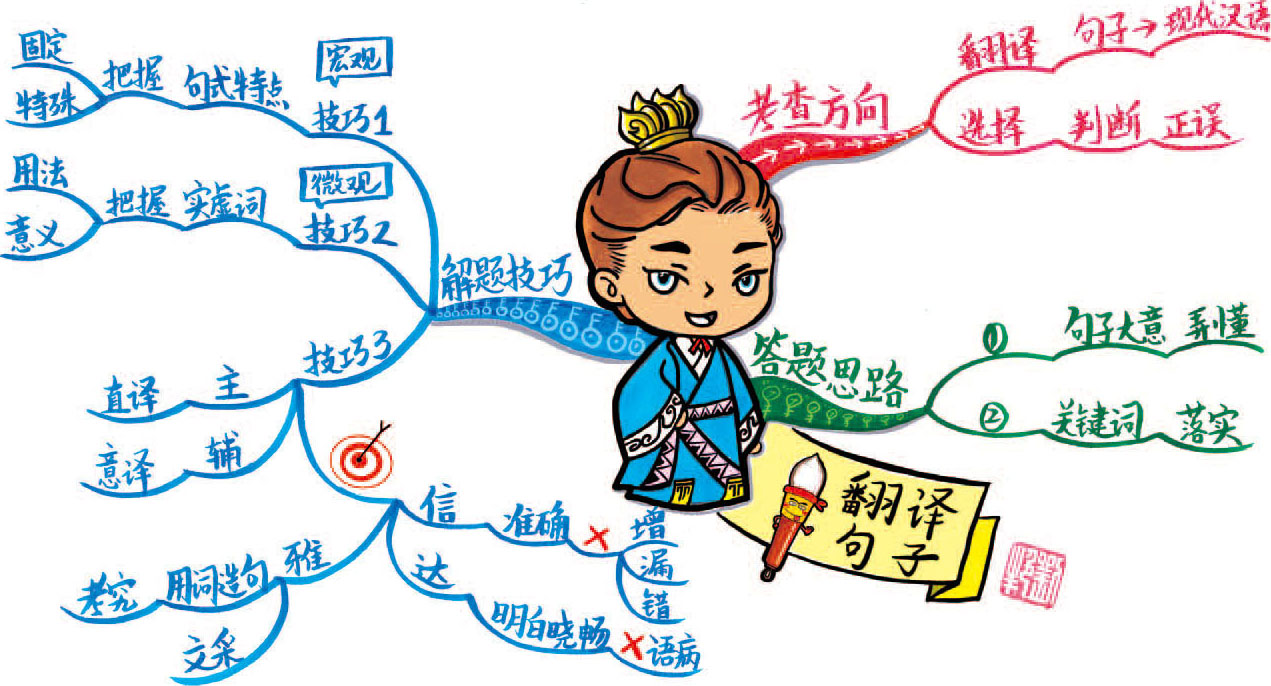 技巧三:直译为主,意译为辅,做到“信”“达”“雅”。文言句子翻译要准确表达原文意思,不增译,不漏译,不错译;要求译文明白晓畅,无语病;进而要求译文用词造句考究,有一定的文采。