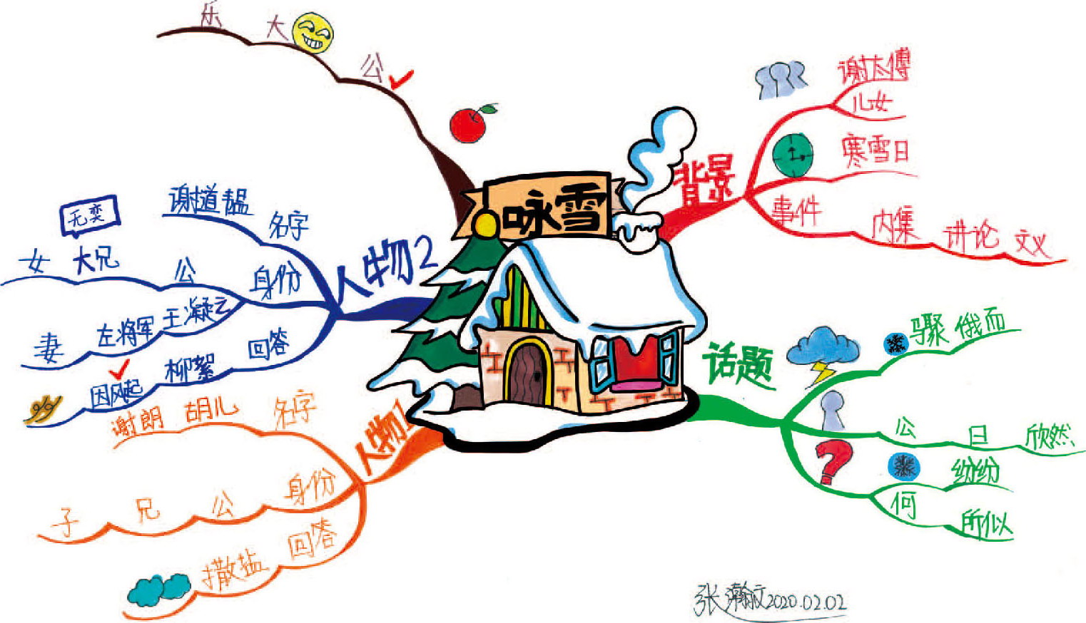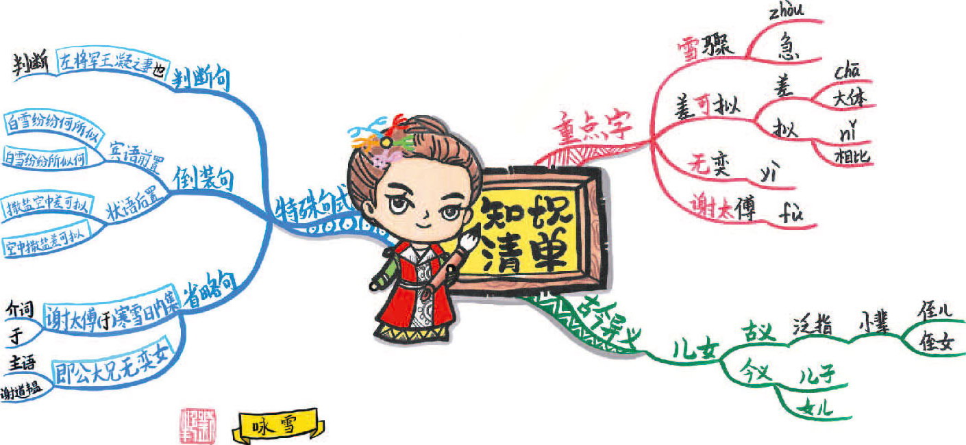 第五部分“大笑乐”暗示了谢太傅更欣赏“兄女(谢道韫)”的说法,所以在“公”和“因风起”旁边画了个红色的对勾表示他们之间的关联性。