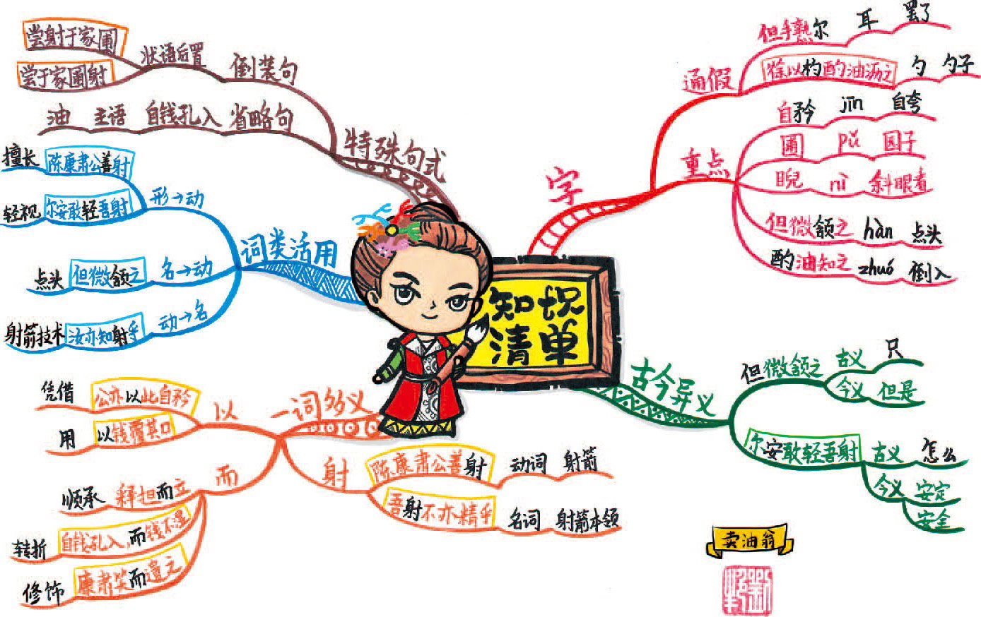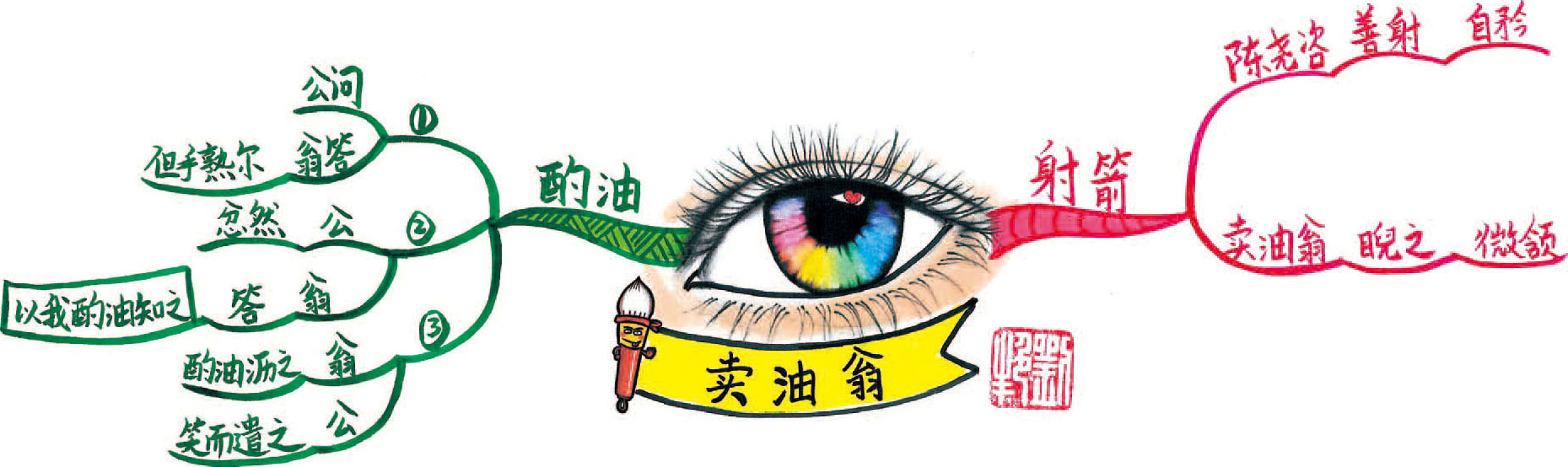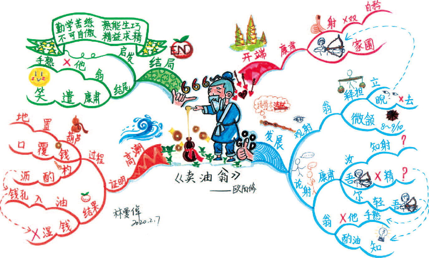 这幅思维导图是一幅背诵记忆型思维导图。为了直观表达主题,我在中心图画了卖油翁酌油以沥钱孔的图像,旁边还画了一个点赞的手势。