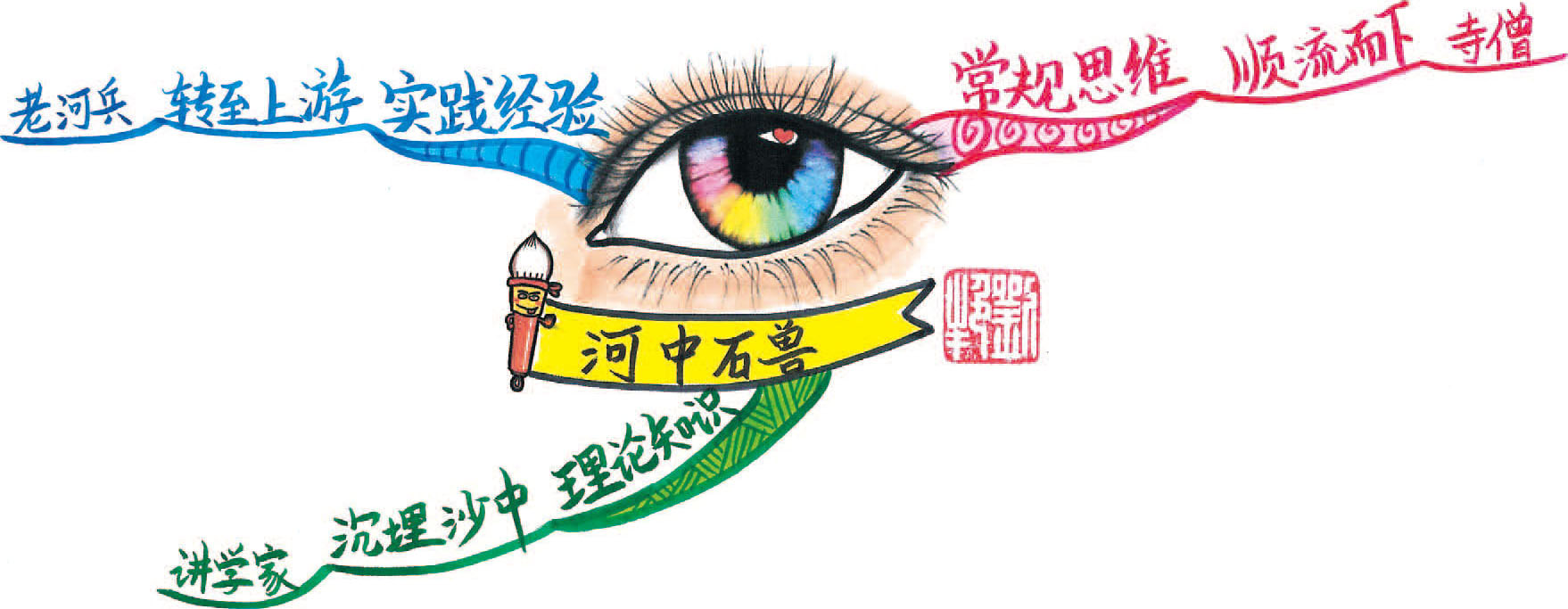 这幅图以文中的三位主要人物寺僧、讲学家和老河兵对落入水中的石兽位置的看法为中心图。每个人的想法不同,但都是有关石兽的,因而只画了一只沉入水中的石兽,添加了鱼儿和水草让画面显得活泼可爱,增添了趣味性。