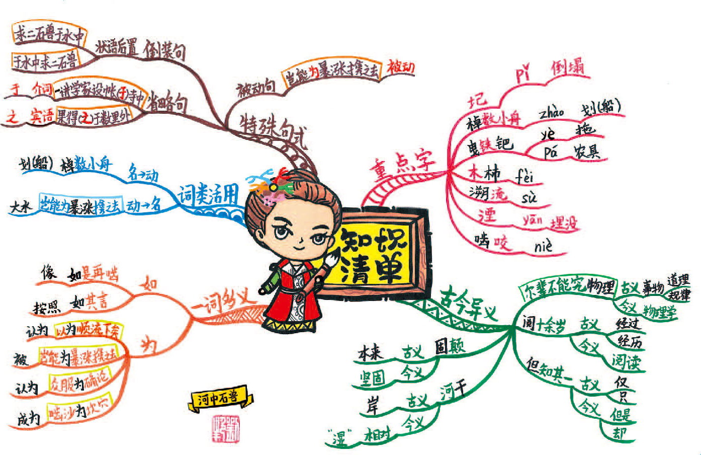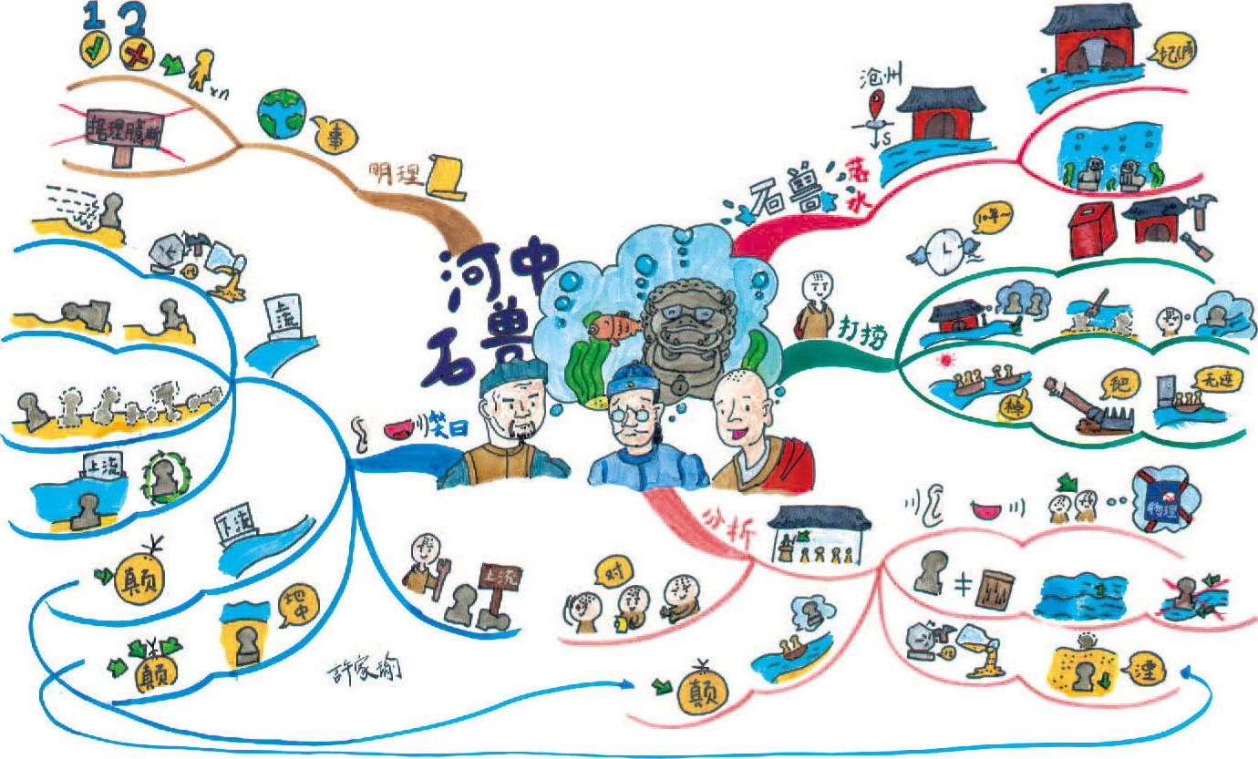 第三部分“讲学家分析”。此处正好连接中心图中的讲学家,直接写了“分析”二字。“一讲学家设帐寺中”,用寺庙中一个人给很多人讲课来直观表达。“闻之笑曰”画一只耳朵,一张嘴表达。“尔辈不能究物理”,此“物理”非彼“物理”,此处是“事物的道理、规律”,现在的“物理”是一门学科。因此在《物理》书上打叉来表达,避免记忆错误。“是非木杮”的意思是这不是木片,用“石兽”不等于“木片”的图就能避免记忆和理解错误。“岂能为暴涨携之去”一目了然,不做解释。“石性坚重”,把一块石头放在秤上,显示数字为一吨,表示“重”;用锤子敲击没反应表示“坚”。用瓶子倒出的沙子像水流出一样表示“沙性松浮”。“湮于沙上”用一只虚线画的石兽表示“湮”即“埋没”,埋在沙下的石兽加向下的箭头表示“渐深渐沉”。“沿河求之”,用之前的图表示,大头娃娃头朝下,身子朝上表示“颠”的意思是“颠倒、错乱”。用僧人点赞、记录、点头表示“众服为确论”,即大家很信服,认为是正确的言论。