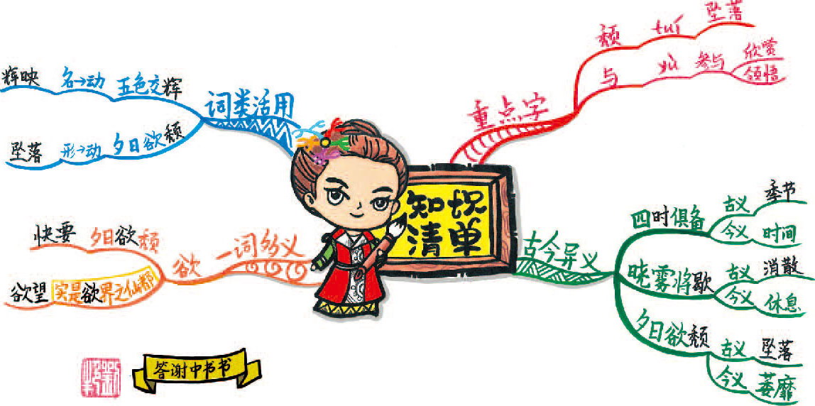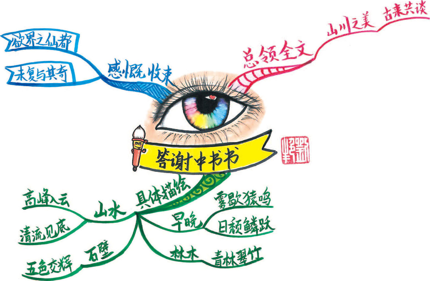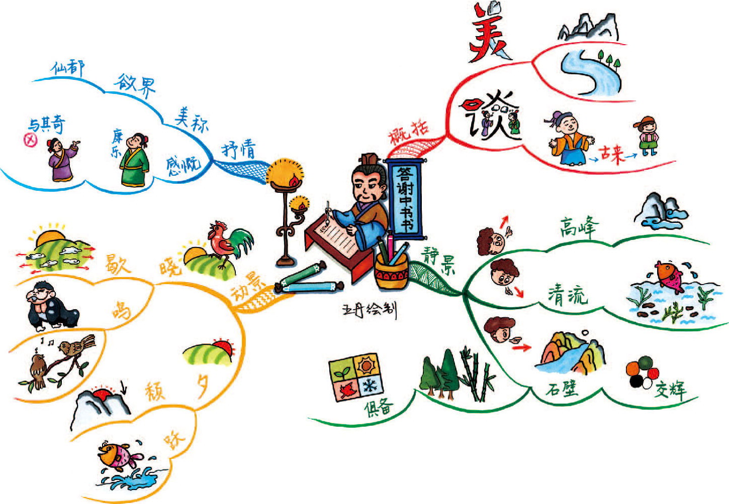 本导图大量运用了图像字,例如,美——山、川融于其中;谈——古人谈话、嘴巴融于其中,代表共谈。这样的图像字可以帮助我们理解原文意境,从而加深记忆。