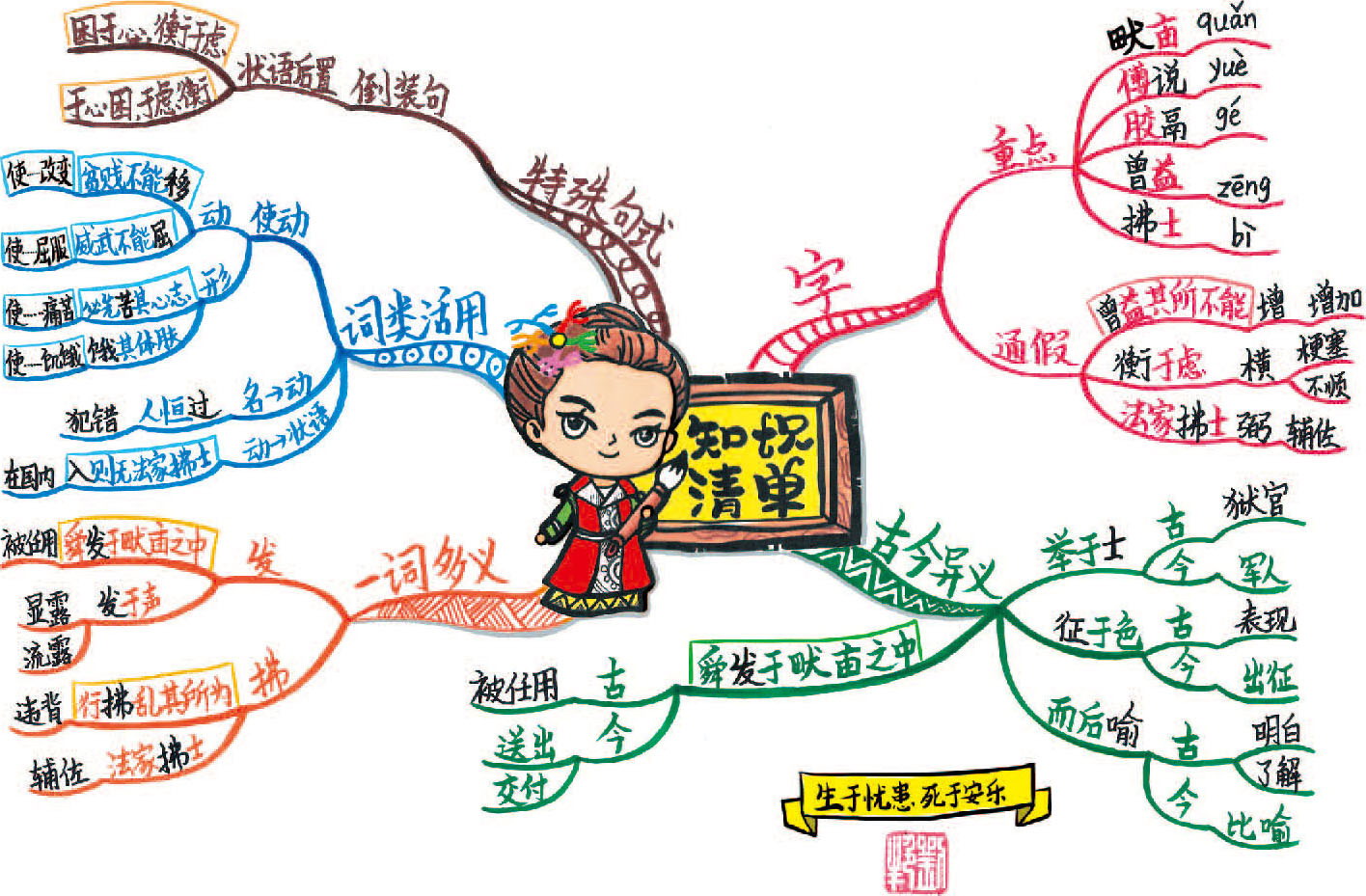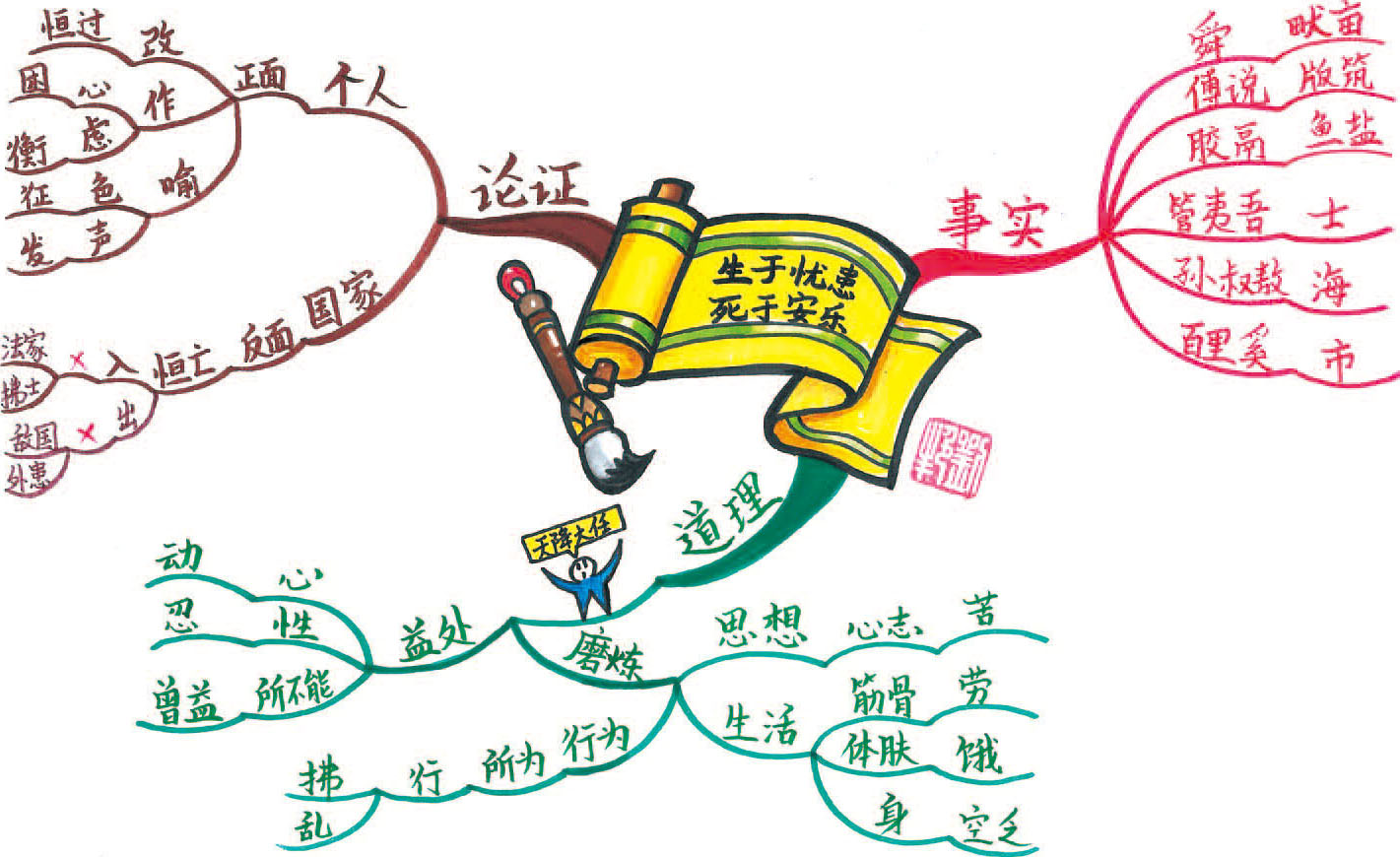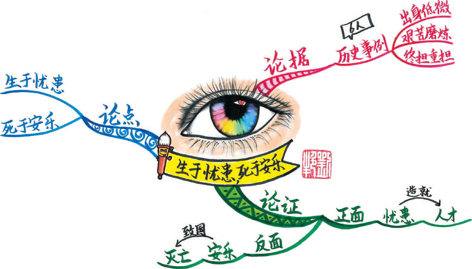 这幅导图的中心图我画了一个卷轴,上面赫然写着“生于忧患,死于安乐”,既体现题目,又表明主旨,简洁清晰。