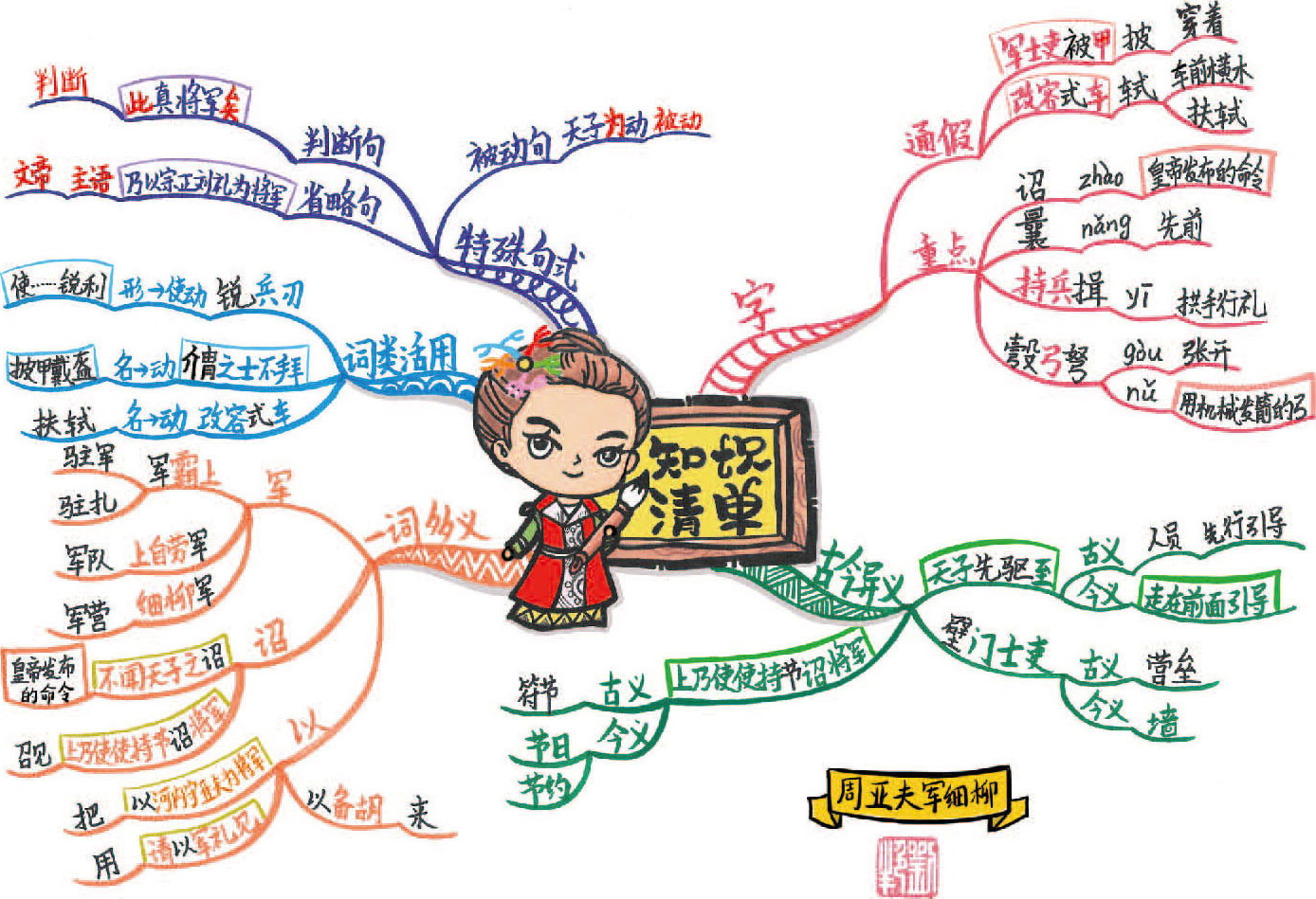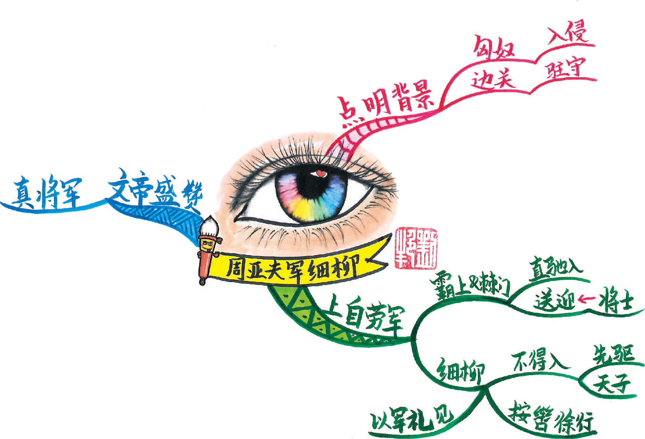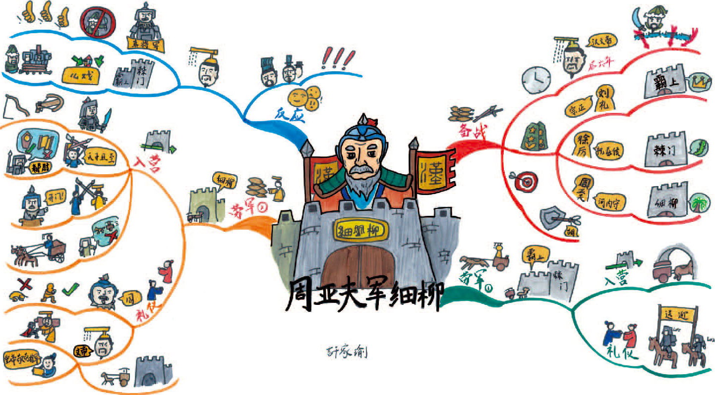 这幅思维导图的中心图画的是周亚夫的细柳营城门,在城门的城名处画了一棵柳树,帮助记忆。城门之上是周亚夫的肖像画,威风凛凛,颇有“一夫当关万夫莫开”的气势。他的身后是猎猎飘扬的大汉的旗帜。