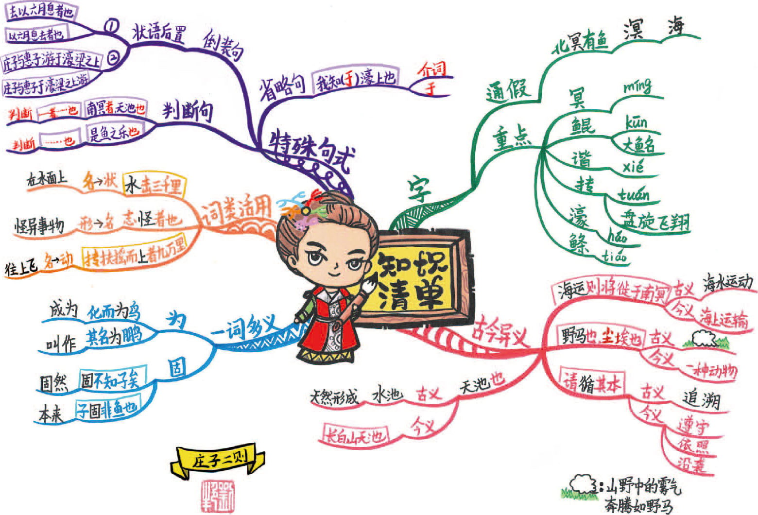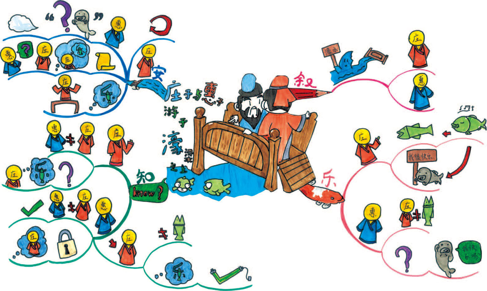 这幅图的中心图中两个卡通人物在濠水桥上游玩,看到河中游鱼,进而机智巧妙地辩论。“濠梁之辩”主要由庄子和惠子的对话组成。我将整幅导图分为四个部分。