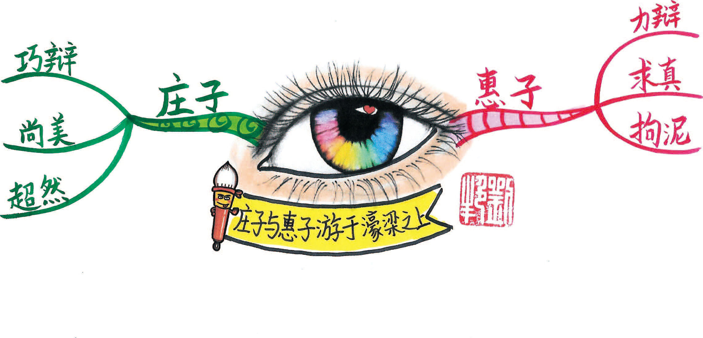 第二部分是“辩”。辩题是鱼乐与否。大纲主干画了一只锦鲤,上书一个“乐”字。这里的“鲦鱼”是白鱼,涂成绿色用以表达自由之意,也便于作比较。鱼儿自由自在唱着歌表示“出游从容”,即悠闲自得。用箭头连接一条白鱼举着牌子“我很快乐”,来表达庄子的观点,鱼儿悠游自在是鱼儿的快乐。惠子认为庄子不是鱼,怎知“鱼之乐”,用问号表示无法知道。