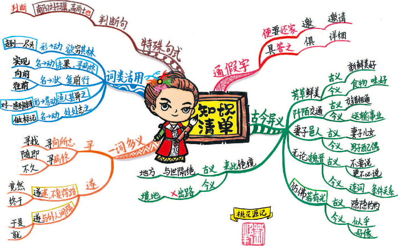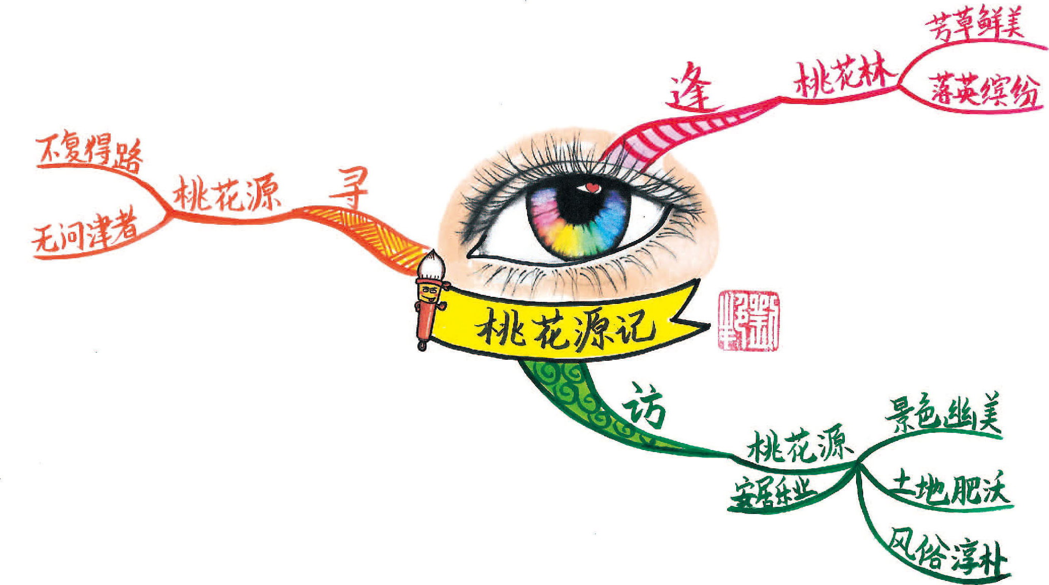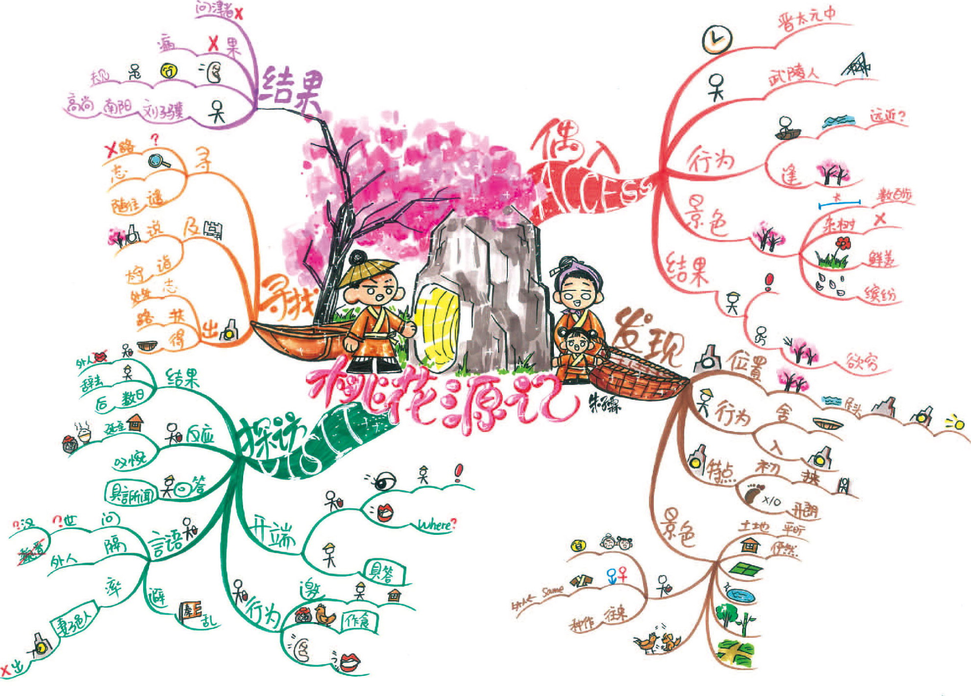 这幅导图分析的是陶渊明的《桃花源记》,全文以武陵渔人的行踪为线索,依照文章的描写顺序分为:偶入、发现、探访、寻找、结果五个部分。