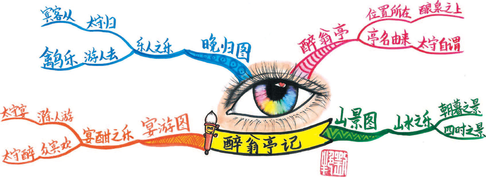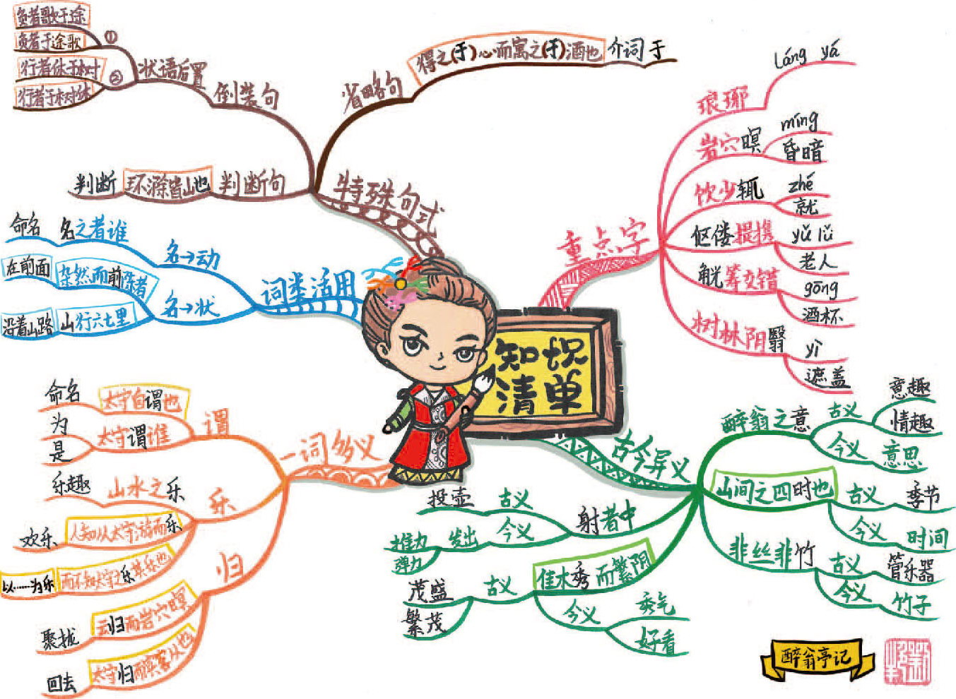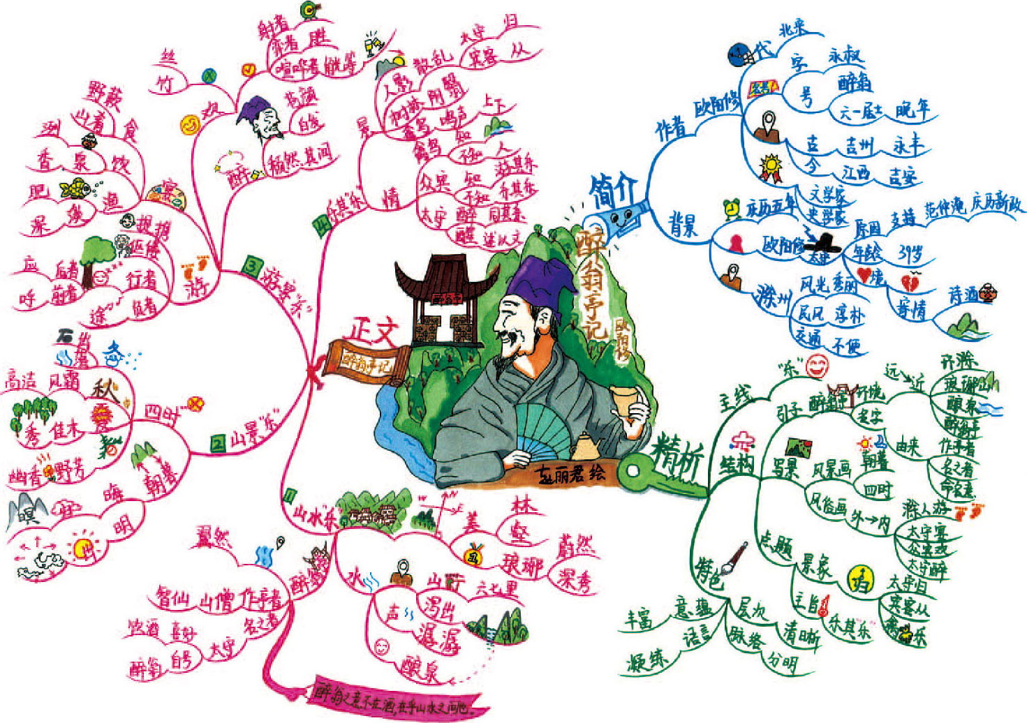 游宴乐:滁人游、太守宴、众宾欢、太守醉,用了游、宴、欢、醉来表达。游,画了一对小脚丫。“负者歌于途”,歌用音乐符号;“行者休于树”,一个小人在树下休息;“前者呼,后者应”,“伛偻”是老人的意思,画了拄拐弯腰的老人,“提携”是孩子的意思,画了一个宝宝。宴:桌子上摆满了碗碟筷,渔、饮、食是根据内容总结出来的,渔:“溪深鱼肥”,饮:“泉香酒洌”,食:“山肴野蔌”。欢:欢乐的表情,非和是分别用图标表示,“非丝非竹”,都在做什么呢?“射者中”,中是射中靶心,“弈者胜”。喧哗者“觥筹交错”,觥筹是酒杯,“觥筹交错”是酒杯碰撞的样子。醉:喝醉的符号,如倒下的酒杯,头晕眼冒星。太守的样子是苍颜白发,神情是颓然。
