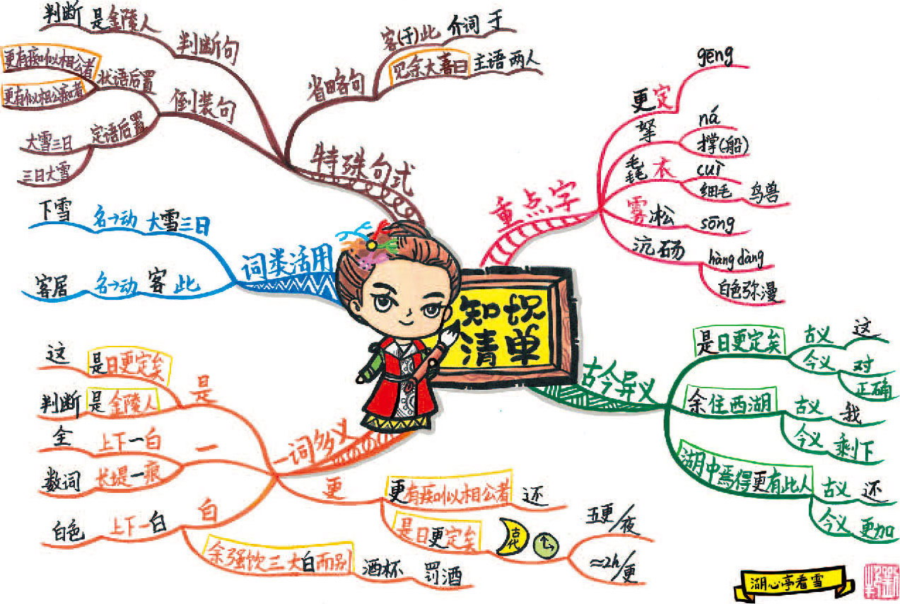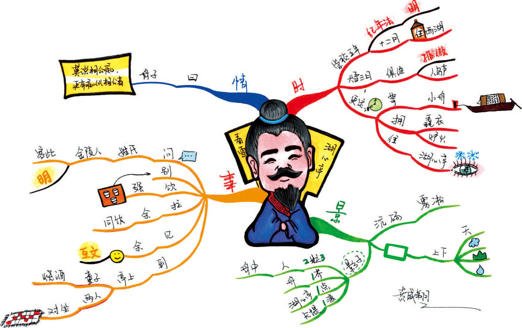第三部分:事。具体写的是湖心亭奇遇。主要是在湖心亭上遇“知己”,在短暂的交谈后饮酒离开的事。其中要注意的是,“见余大喜”中的“大喜”是互文,不仅我喜,而且“知己”也喜。这部分用了“到”“见”“拉”“饮”“别”“问”六个表示并列关系的动词作为二级分支上的关键词,便于我们清晰回忆整个事件的经过,层次分明。