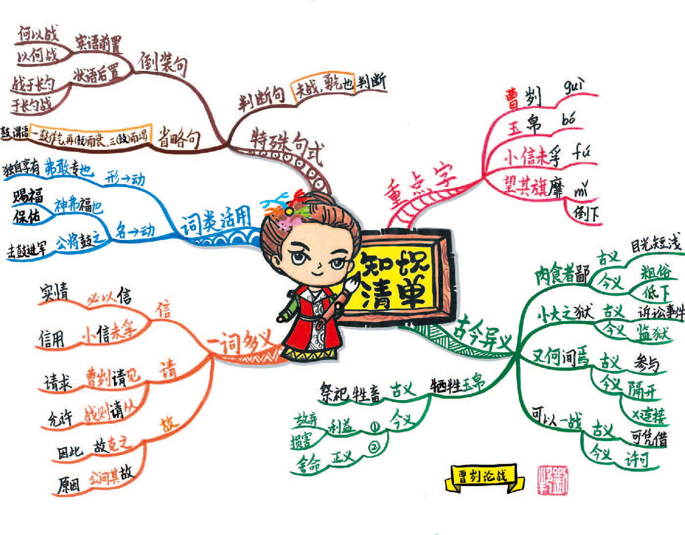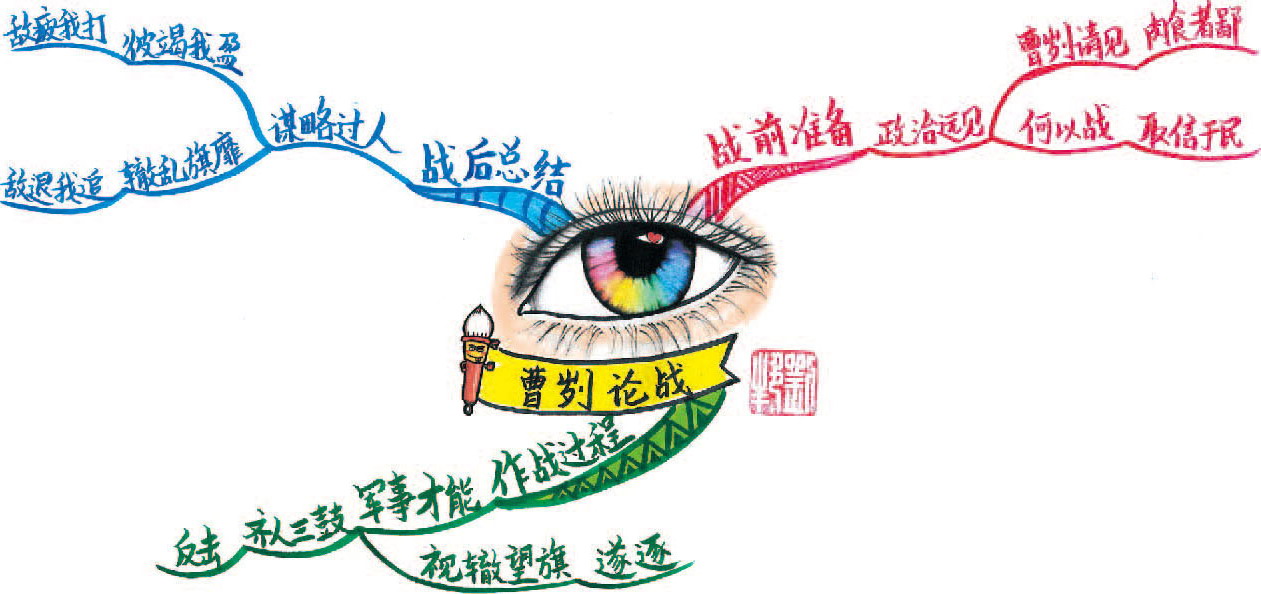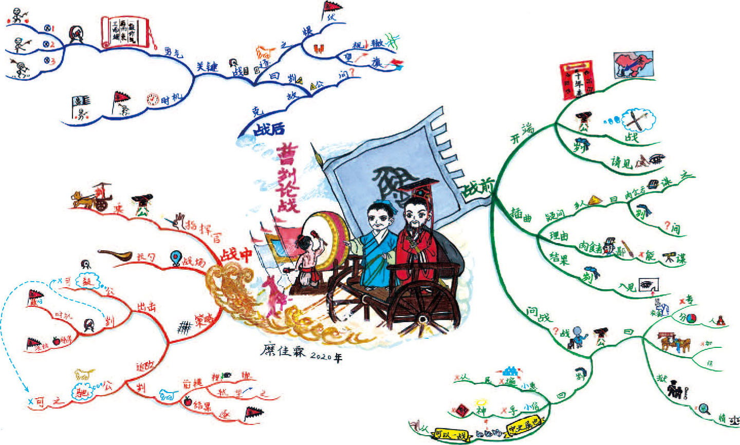 创作导图的关键是找到底层逻辑,“拎”出三大主干。曹刿的“论战”虽贯穿全篇,但梳理后可清晰地分为战前、战中和战后三部分,确定主干是导图的根基。