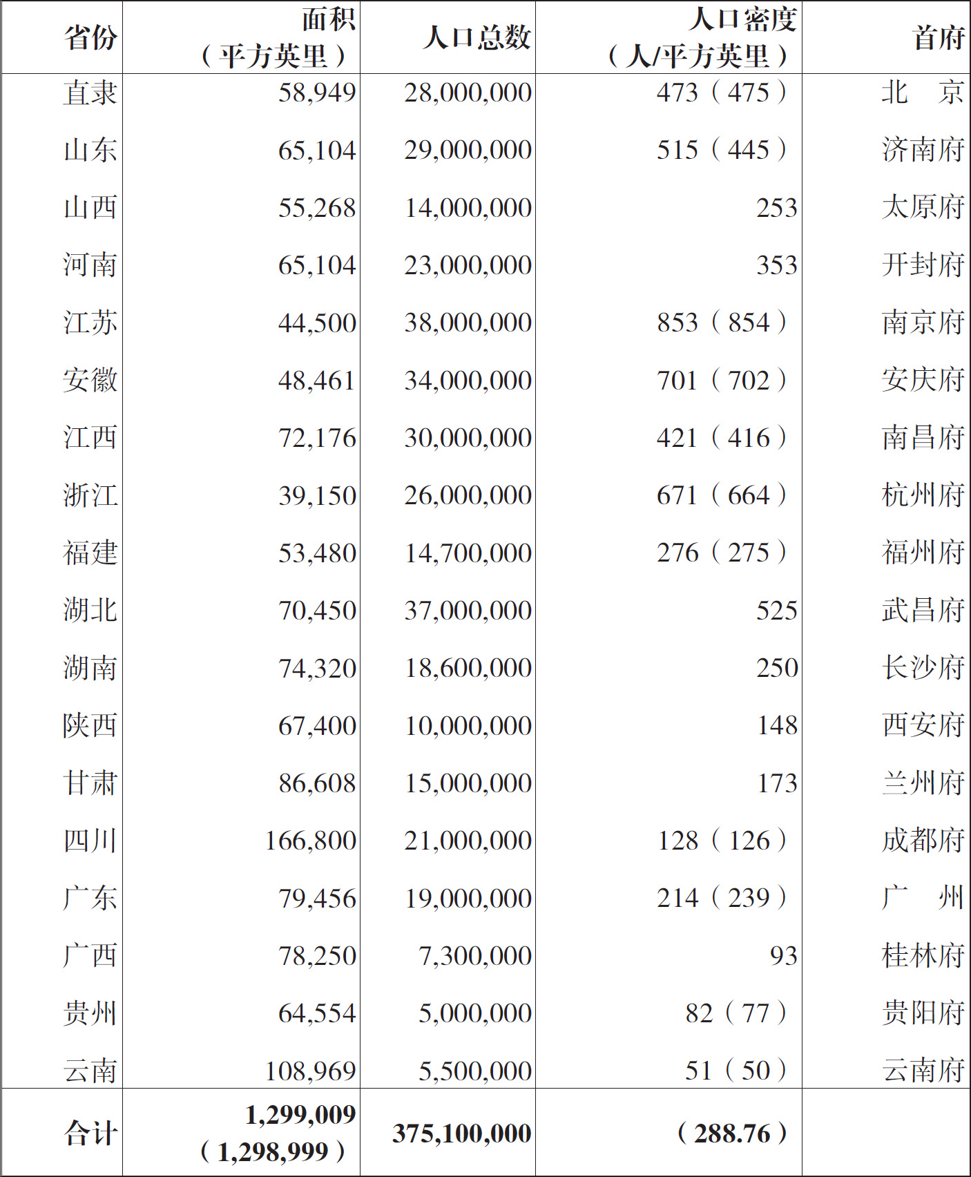 中国行政区划共分十八个省(指当时的中国),不过这个国家的地理数据漏洞百出、各个版本相互龃龉、很难让人认同。下表是一位大学土木工程教授通过内部渠道获得的最新数据,具有一定的权威性,是截至目前最可信的版本: