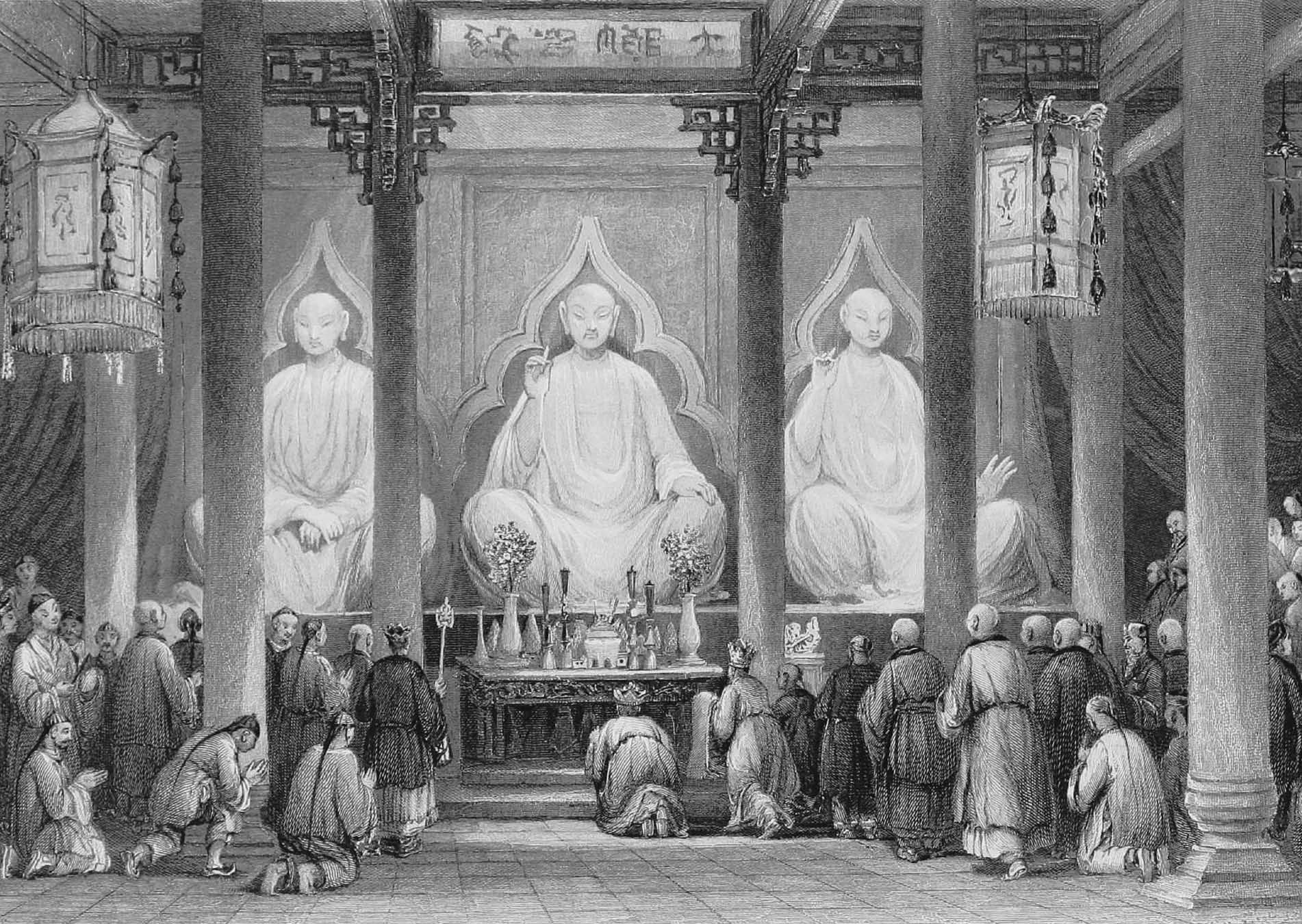 佛教拜祭仪式相当繁复。熬到住持位置的老和尚长跪神像之前,不停地用额角触碰一块被教中人奉为神明的石头,以此彰显神祇的崇高与信仰的虔诚;不过对于绝大多数信众来说,隆重的仪式只是无谓的表演,不值一哂。佛教流传地域虽然广阔,但奉教者与庞大的人口基数相较,实属凤毛麟角;即使像大清帝国这样寺庙遍地、碑塔林立的泱泱大国,莫之能外。除了举办宗教仪式时多数人显得漫不经心之外,佛寺在中国人眼里与神圣不可侵犯的宗教设施相去甚远,阿美士德勋爵朝觐归来,曾假道广州拜访当地大员。这位勋爵的北京之行处处碰壁、所获无多,不过一行人在广州的生活得到了官方的照拂:特许在海幢寺内住宿。大佛金身被搬离基座,寄存于河对岸一处寺庙内,主殿被辟作教会使团的用膳房。勋爵的随员没有放过这一细节,他们不无感慨地说:“中国人与佛教的关系若即若离,改变他们的信仰并不是什么难事;举凡深入民众身体力行的西方传教士,均深知个中秘辛。”