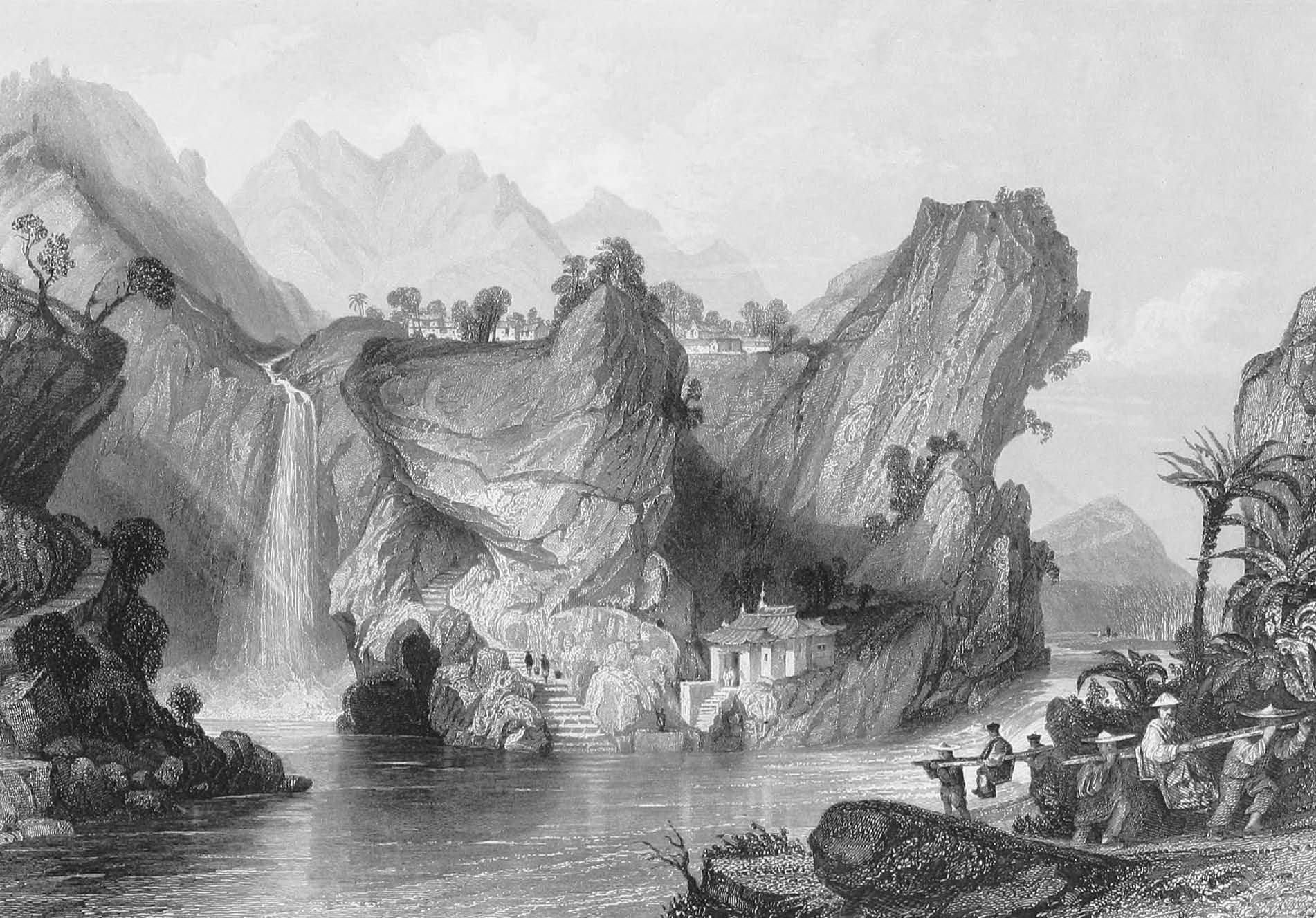 石门之名得自长江两岸相对而立、如擎天之柱戟指云端的孤峰。中国历代迁客骚人面对此人间奇景、大自然的绝唱,无不驻足流连,留下大量极尽铺排夸张之能事的清辞华赋。不过石门之险峻秀美,即便以长于舞文弄墨、好发惊人之语的中国人,所言也无半点虚饰。由于山之高度与水面的宽度不成比例,再高明的画家,构图方面也难做到尽得其意。进入幽深的峡谷,高逾一千英尺的绝壁倚云而立;一线天光游移岸畔,投下如墨般浓厚的暗影。旅人潜行其间,除却明灭浪尖的舷灯、翻卷脚底的白浪,一路朦朦胧胧,几乎不辨一物。行约里许,便是声名远播的雾谷。四千年江水的雕琢,打造出一片雨气空蒙的幻境。如果游人有足够的勇气继续走下去,行不多时便会邂逅一挂落差一百英尺以上的瀑布,撞得珠玉满怀、白雾侵肌。蒙络摇缀的枝叶间筛下的缕缕清光透过雾霭,照亮凝脂一般绿莹莹的江水。中国的方志修撰者声称,石门瀑布翠色可掬,蓝草之色虽纯,犹不过此。