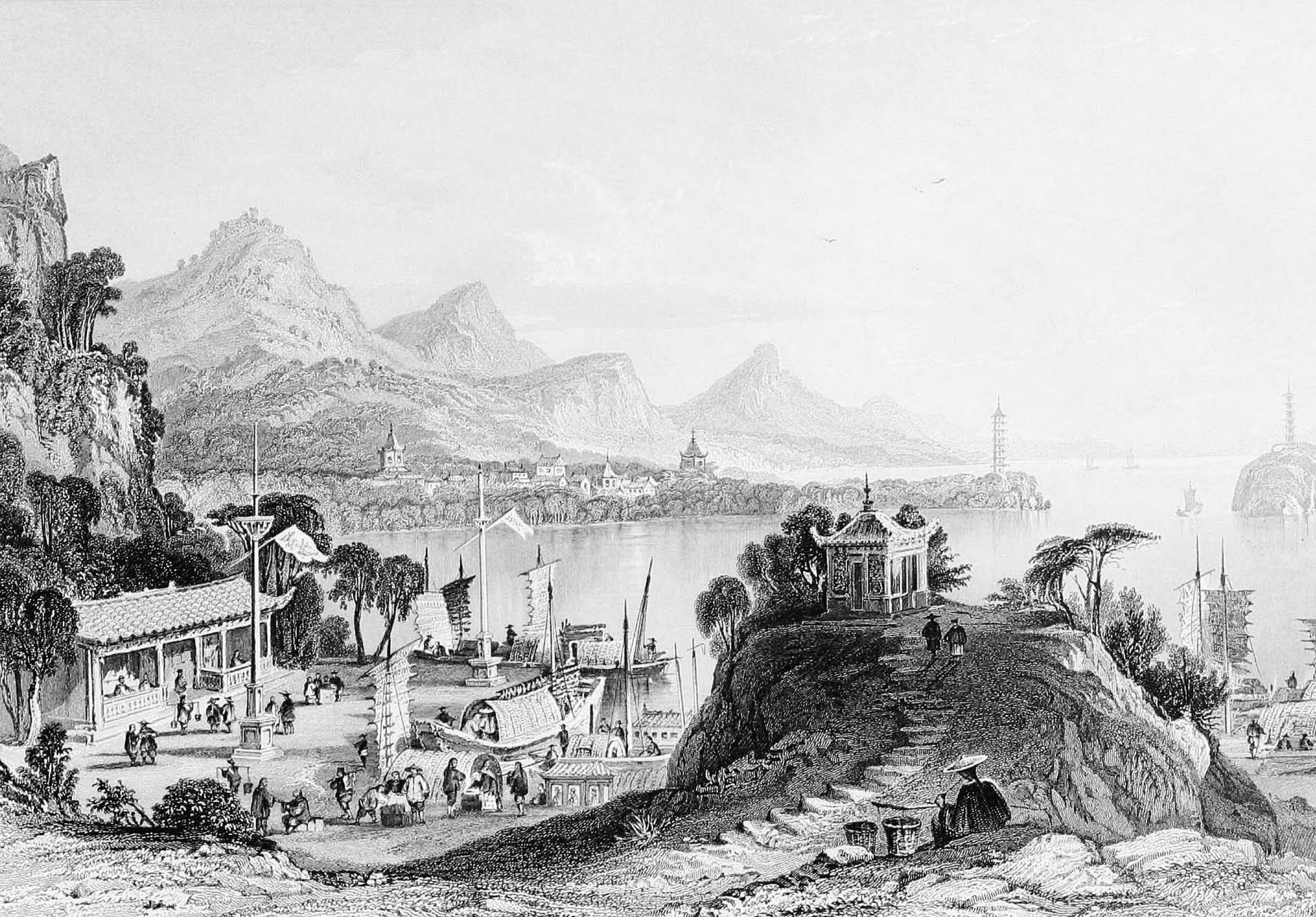 南京东南隅悬垂于太湖之滨的山峰,景致之奇,与七星岩相比有过之而无不及。山体多为石灰岩,禁不住海水的浸泡、江流的侵蚀,日夕悄然变化,积久遂成异观。太湖水域烟波浩渺、河港交错,纵横湖区的扬子江、运河等大江小溪,只要两岸有石灰层分布,溶洞、悬岩、水中孤石、风化沃土层覆盖的小岛便不绝于途。太湖多山的一侧,地形更为奇诡。湍急的溪流激荡冲决,除了造就奇形怪状的石灰岩体之外,质地更坚硬的岩层也被凿削出深沟大阪,仰之如同幻境。坐落在苏州城北三十英里处的洞庭山,一百五十英里澹澹碧波,环抱一山碧黛,壑险洞幽,钟灵毓秀,堪称中原胜景。我们邂逅的中国旅行者用那种中国人特有的咬文嚼字的腔调,有板有眼地告诉我们:“西北有山四十四座,山势险峻且以文化气息浓厚久负盛名者,当首推马山;由此发端,有四十一山迤逦东行、连绵不绝,其中西洞庭山如凝脂墨玉、直插云霄,有俯瞰天下之雄姿;地接东南、凌波驭虚,若论巍峨峭拔之形貌,太湖东部一带凡四十七山之中,又以洞庭山独占鳌头。”为了形容江南美景,中国的文人搜索枯肠,极尽堆砌词藻之能事;流连青山、泛舟碧水,是中国迁客骚人素怀的梦想。深谷流翠,层林摇风;掩映田舍数家,炊烟袅袅;簇拥楼宇几处,衔月映日。高楼广厦的空间布局也很讲究,街巷交错,宛若棋盘。崇高与滑稽为伍、雅致与粗鄙相邻,这是中央帝国的人文奇观——宗教、法治、民俗,强烈的反差无处不在——可想而知,中国人撰写的文字资料,华而不实、狗尾续貂的情况也屡见不鲜。