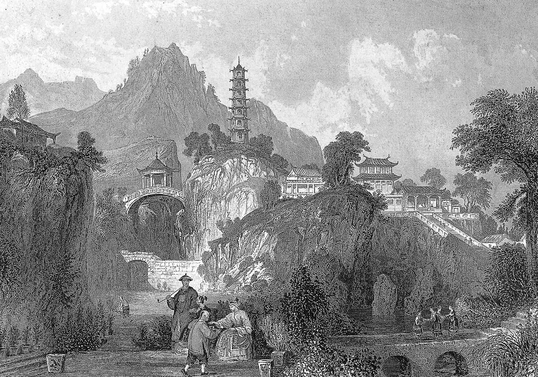 太湖东岸附近水域小岛星罗棋布、岬角鳞次栉比,岸头起伏的冈峦衔水接天,景色冠绝天下。钟灵毓秀之地,人口自然繁庶,但见一线连绵的群山脚下,阡陌纵横、炊烟袅袅,古色古香的民居隐现林莽间,顺着湖岸绵延数英里。湖岸突出部与对面小岛峭拔的山巅各建有一座轮廓纤细颀长的宝塔,夹峙进出古运河港口的水道。此处岩体环抱、狂风难入,一年四季波平如镜。调入沿大运河一线投送杭州的外来商品,或外运棉花等本地农产品的船只帆影未动、欸乃先闻,激起的微浪扶摇日月星辰。经商是利润丰厚的行业,大清帝国当局自然不忘分肥。一面耷拉在高杆之上的龙旗,表明其下的建筑物就是官方设置的税赋机构。