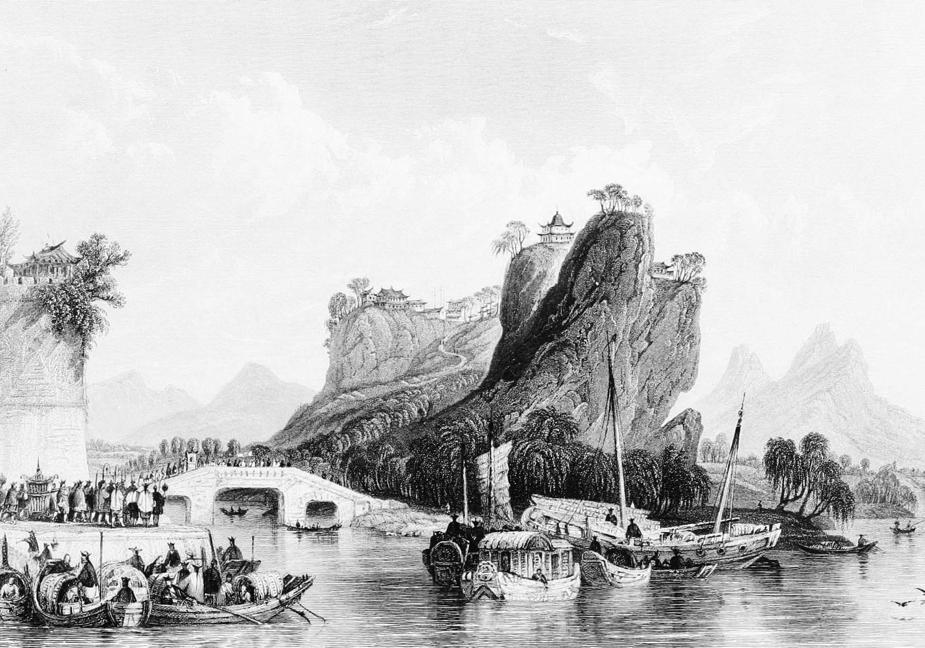 南京石拱桥全段使用红色大理石建造,楔形石料确保拱顶契合紧密、如月如虹雄跨同为石材砌筑的桥墩之上。中国的能工巧匠还在桥面两侧专门搭建了单层桥廊,在不影响牲畜、车驾及大队人马通行的同时,大大提高了桥体对震动波的耐受度。画中大桥的一端是南京城墙,另一端便是闻名遐迩的琉璃宝塔;大清帝国的钦差大臣乘坐的官船方始抵达主码头,身负皇命与英国占领军交涉。