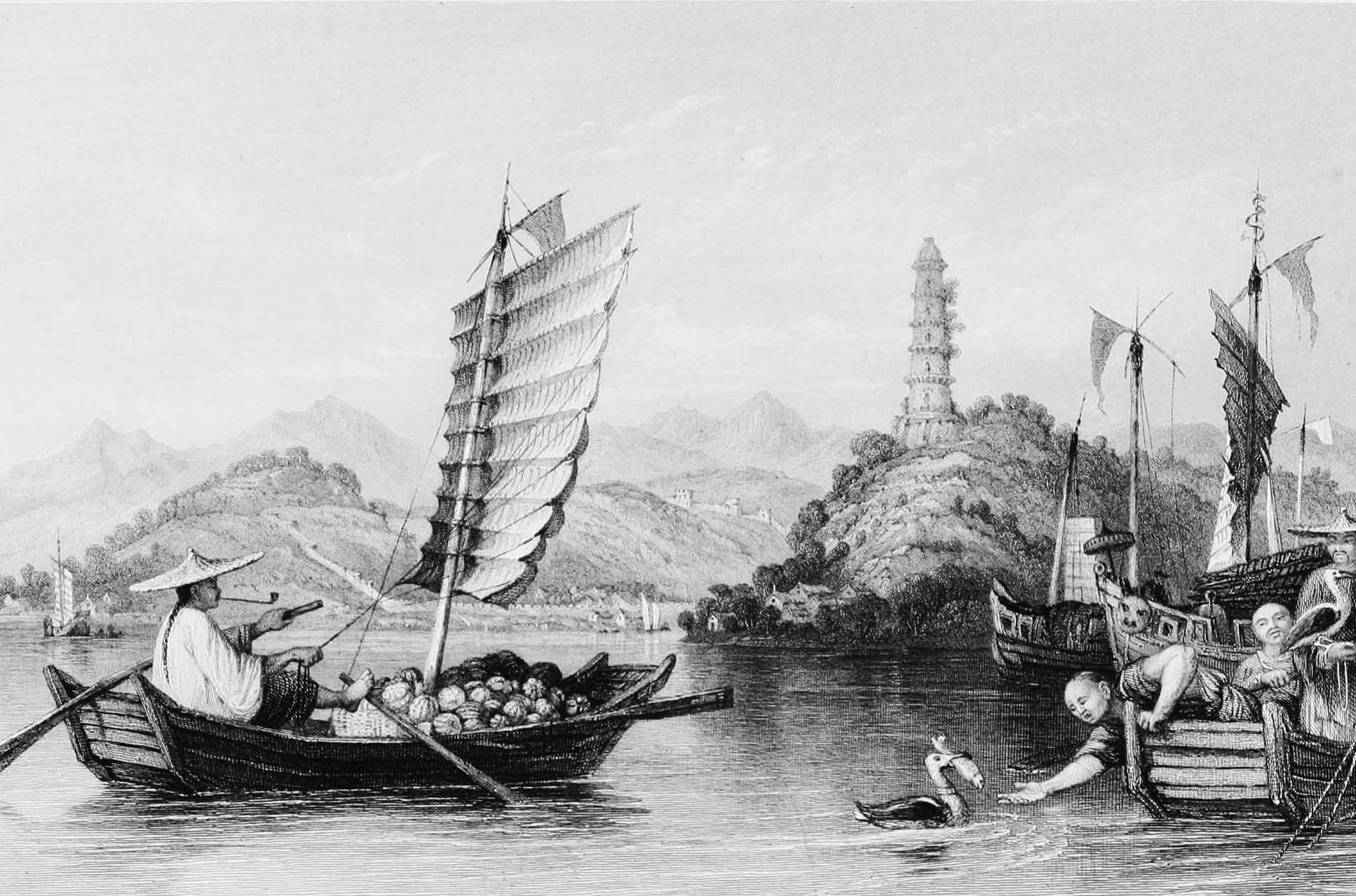 文化传承源远流长,有宗教或者暗昧迷信之荫庇广受蚁民顶礼膜拜,又得至为动人心魄的历史传说为其张目,焦山因此受到大清帝国一代圣明之君乾隆的垂青。乾隆帝诏令在确保焦山原生态不被破坏的基础上,修复毁弃古建筑、新建适合皇帝出巡江南省期间驻跸的行宫。皇帝的谕旨,地方官自然得不折不扣地执行。春秋两季,乾隆常在焦山行宫流连,出入清新雅致的林间宫室,享受江南的和风煦日,观赏训练有素的鸬鹚翻飞江面、潜水捕鱼。“我们看到,”一位现代旅行家说,“江右烟波浩渺的鄱阳湖上,五六只载满一种捕鱼鸟的小船。这种鸟,有些地方叫‘鱼鹰’,有些地方叫‘鱼鸭’,这些名字只表示鸟的功用,与动物分类体系无关。我们费尽周折将一只渔船招至岸边,对鱼鸟做了一番极其详细的观察。这种鸟似鹈鹕而非鹈鹕、似鸬鹚又非鸬鹚,其背部羽毛颜色较深,几近黑色,站立起来差不多跟鹅一样高,不过体态轻灵了许多。鸟喙较长,上喙呈弯曲状,这是食肉猛禽的共同特征。我们提议买只鸟回去研究,可渔夫说什么也不肯出手。考虑到训练这种鸟捕鱼非常劳时费力,惜售原属情理之中。为了防止大鸟一去不还,每只鸟的一条腿上都系有一根细绳。有些鸟的颈部还套着一只铁环,松而不脱,看起来是为了防止鸟儿‘私自’吞咽猎物。”铁环上同样拴有一根细绳,另一端系在腿上。鸟儿捕到鱼后,渔夫当即拉近渔船,并用一根尾端锔成钩状的竹竿打捞上船。这根竹竿也是渔夫惩罚懒散“懒汉”的刑具:哪只鱼鹰敢消极怠工,主人会毫不留情地用竹竿敲打。这些鱼鹰倒也乖巧,背上只消吃那么一下,便会争先恐后地跳下水去。