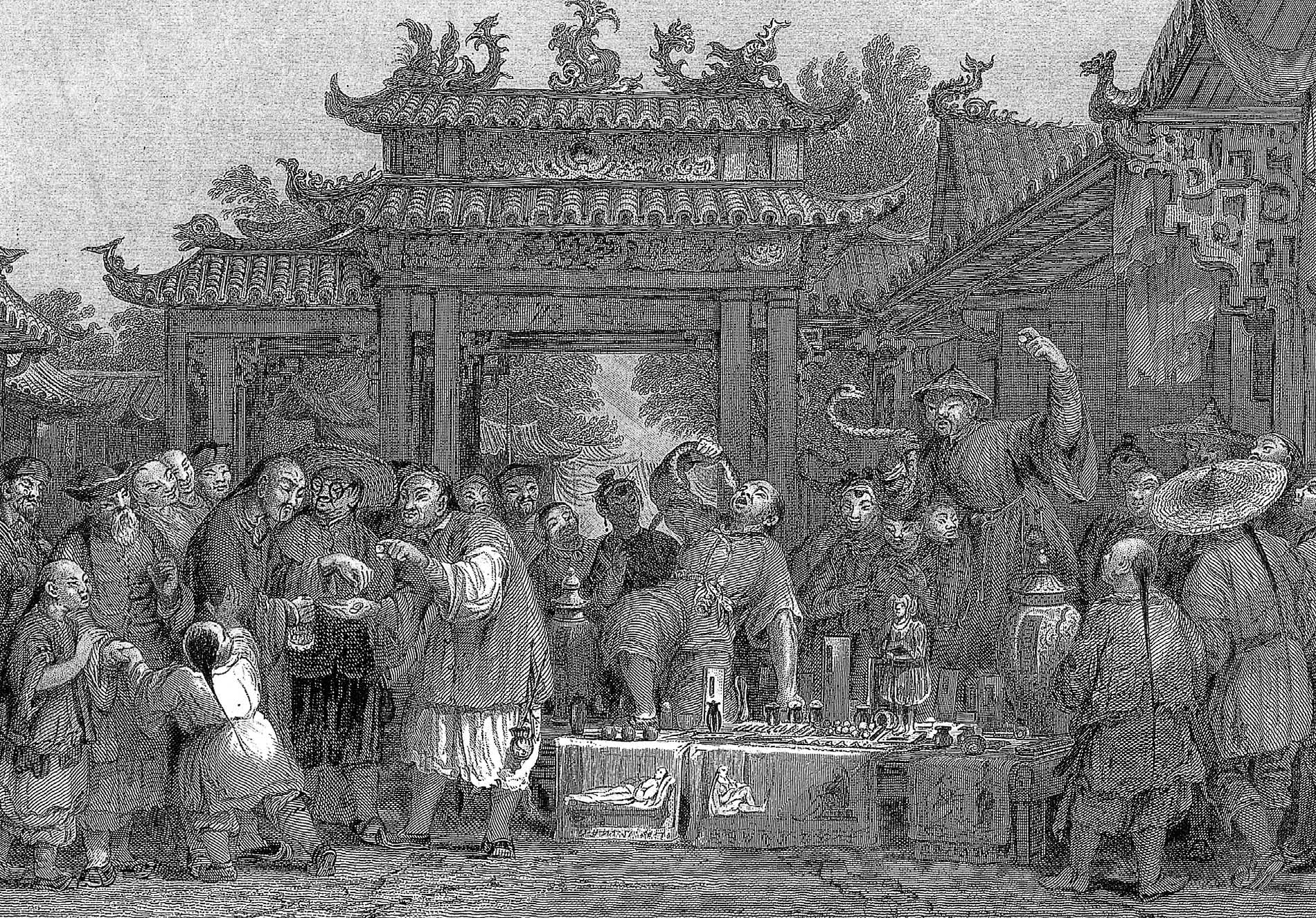 在大清帝国以米饭为主食的地区,沿街摆放的食摊和直着嗓子拉客的摊主是最常见的街头景观,东昌府为其中之一的京杭大运河沿岸,情形更是如此。东昌府兵营的职责是检查过往商船,征收盐税。船工充分利用短暂的停留时间,上岸打尖吃碗米饭。一名兵丁在小吃摊附近逡巡,替船主或工头看管这些苦役;而船工齐集在一柄用竹竿撑起的硕大遮阳伞下,享受女摊主端上来的米饭。摊主提供的无非是碗筷之类的食具,虽然简陋粗粝,却也不乏田园风味。食客团团围定一具土坯炉灶,盛满用蔬菜、大米加陈年油脂或熬炼动物油的下脚料——油渣烹制、香味熏蒸的炒米饭,然后端到嘴边、贴紧下嘴唇,竹筷扒拉几下就能吃得一粒不剩,并且很少出现泼洒的情况——中国人的吃饭技巧确实令人叹为观止。跟西方人一样,中国人也有随身携带烟具的习惯。不过他们的烟杆长得出奇,衣袋外面总是露出一大截。整个运河航线上这样的征稽站很少,故此船工们抓住这个难得的机会,除了吃个肠满肚圆之外,还要带上一两顿备用餐:各人腰间挎个褡裢,起行前令摊主填满菜饭,配套的吃饭工具自然少不了筷子,还有用硬木刮成的平勺。其时摇唇鼓腮、一双筷子在嘴边乱舞的船工身边,几块两头拴着绳子的木板隐约可见——这个便是船工挽具,拉纤时垫在胸部,比直接套一根绳索来得轻松。