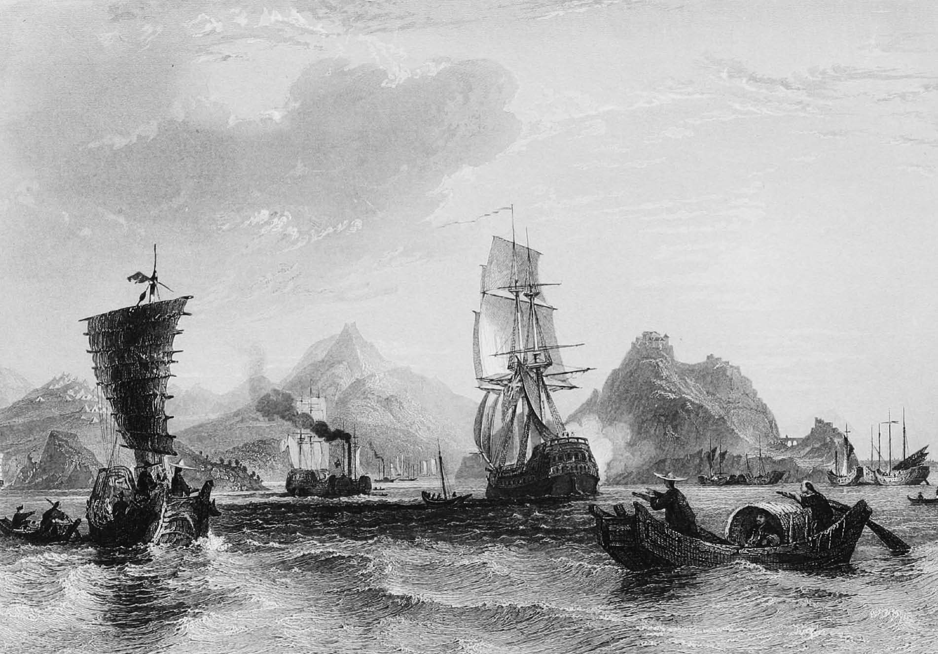 珠江航道夹在穿鼻、大角两炮台间,为大清帝国江南都会——广州提供可靠的屏障。河口向西,便是地域辽阔的珠江三角洲;其上河流广布但水深有限、流量不大,仅可承载普通的平底小船。即便存在航行限制,珠江三角洲水系依然是地方商贸活动的强大后盾,为广州、澳门两地繁忙的货运提供了有力的支撑。鸦片战争期间,迫于清廷钦差大臣林则徐的咄咄逼人之气势,英国皇家海军不得不采取军事手段占领穿鼻。阿洛姆先生的版画展现的就是中英两国兵戎相见的场景。