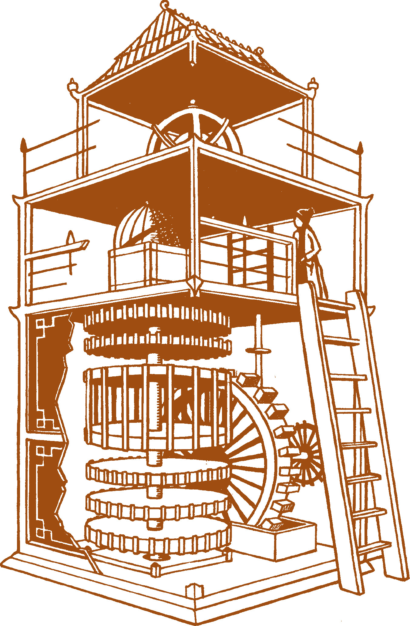 另一个有着华丽名称的钟是中国官员苏颂(2)在1086年到1092年间为宋朝皇帝(宋哲宗)研制的水运仪象台。这也是一座机械天文钟,但它体积巨大,占据了一座超过10米高的钟塔的好几层。它由铜浇铸而成,由水力驱动。在塔顶的平台上,一个球体记录着行星的运转。水运仪象台一直正常工作,后于1126年在蒙古军队的入侵中失去下落。
