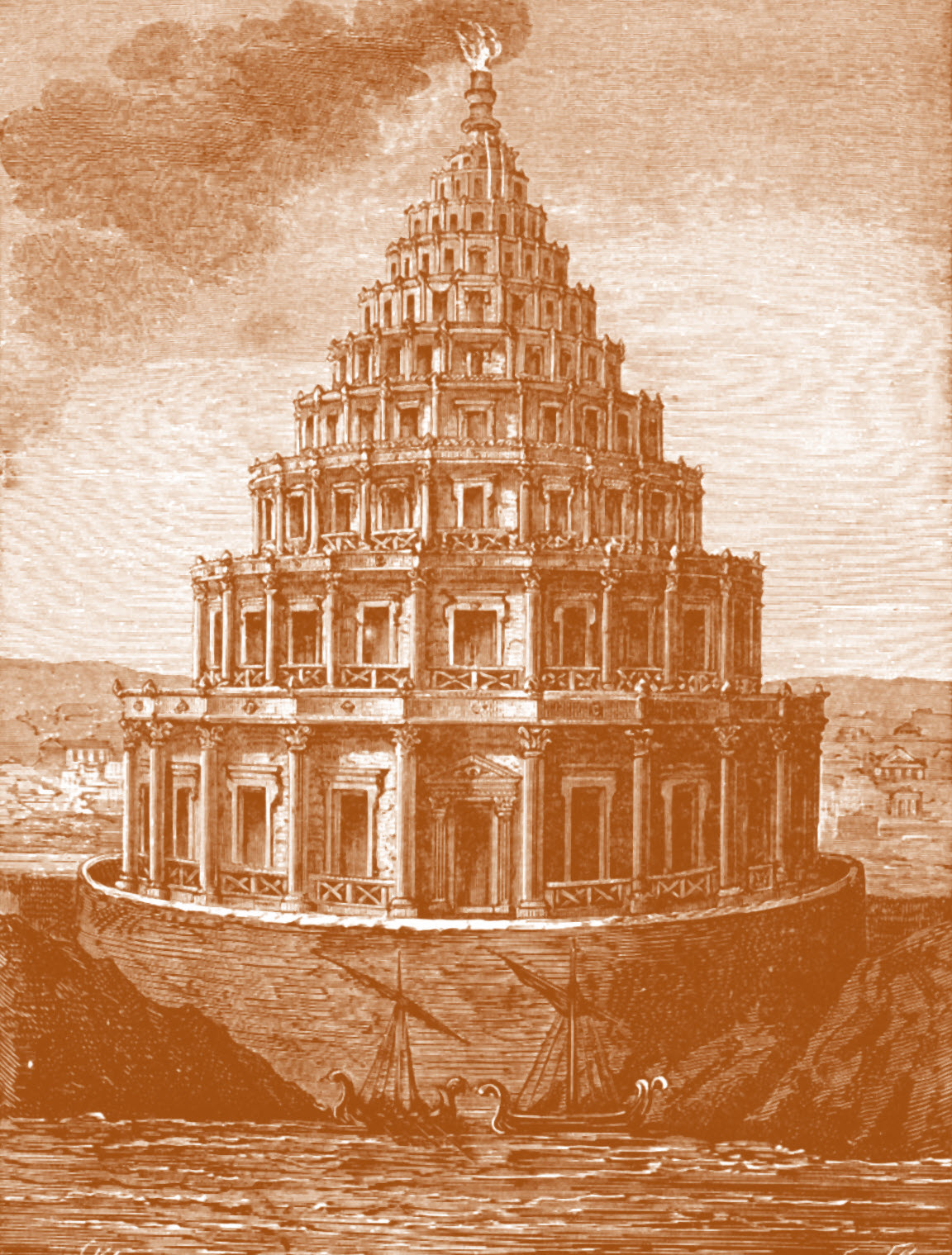 在亚历山大大帝死后,人们在岛上兴建了一座巨型灯塔。该灯塔于公元前280年开工,公元前247年竣工。这座由石灰岩筑成的塔高约106米,在巨大的方形底座上,矗立着八边形的塔身,最上面是圆形的塔顶。据传,从160千米外就可以看见塔顶熊熊燃烧的火焰。在白天,一面巨型镜子被放置在塔顶,向海的方向反射阳光,让海里的船可以找到回家的方向。