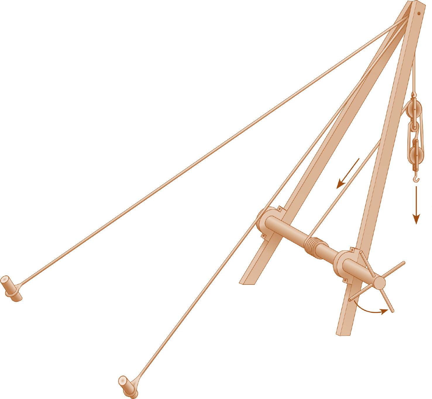 最简单的希腊起重机被称为三滑轮起重机(trispastos),由臂架(由两根连接在一起的桅杆组成的倾斜支柱,上面挂有绳子)、绞盘(一个可以转动和拉扯绳子的杠杆)和带有三个滑轮的滑轮组组成。这让操纵者获得了3对1(三个滑轮对一个重物)的优势,一个人可以举起重达150千克的重物。在诸如帕特农神庙等许多宏伟建筑的施工过程中,起重机都发挥了重要作用。对于更重的物体,希腊人会使用一种五滑轮组的起重机(pentaspastos),甚至是更复杂的3×5组的起重机(polyspastos)。