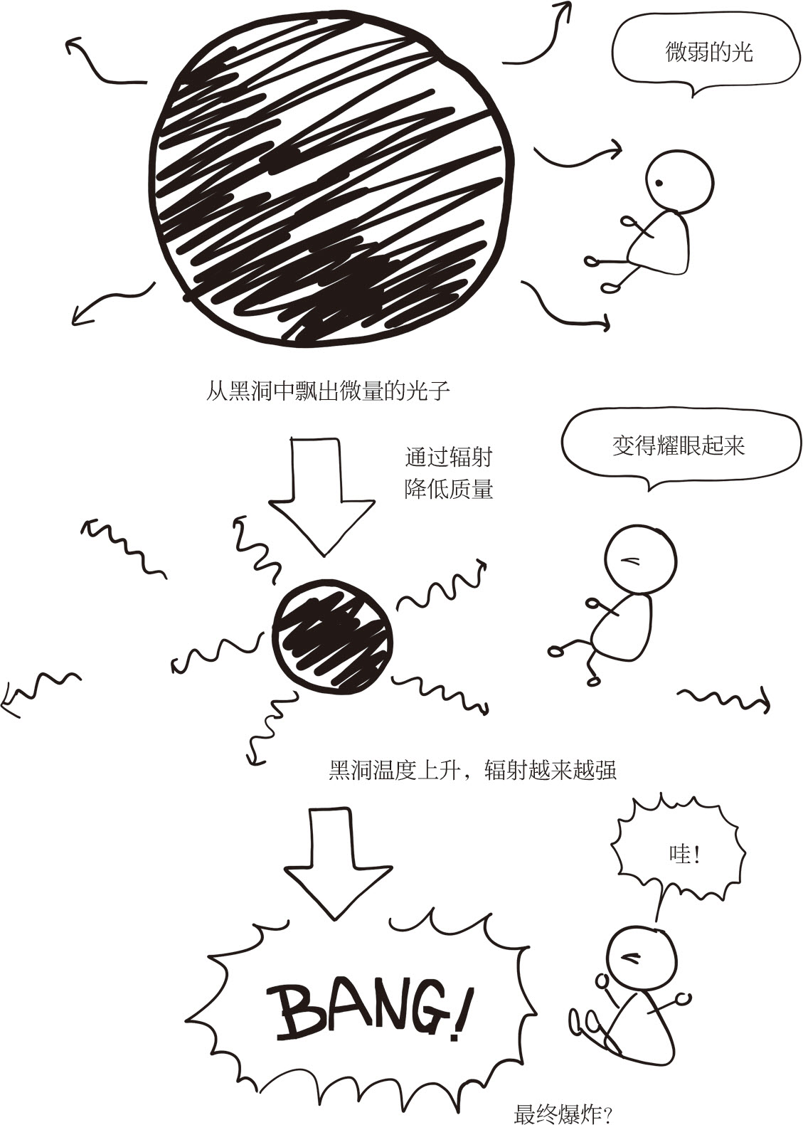 假如黑洞的质量小,其温度高,黑体辐射将变强。黑体辐射让光子从黑洞中飞散出来,而这至少能让黑洞减少微量的质量,也因此会提高微小的温度,使黑体辐射变强。像这样,质量较小的黑洞会越来越小,辐射越来越强。
