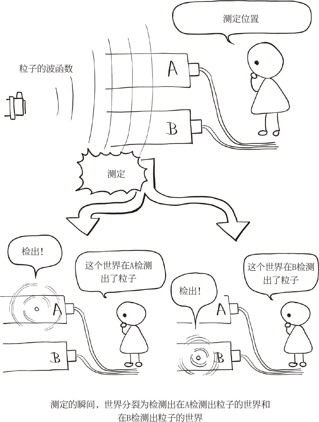 但根据埃弗莱特的观点,检测到的瞬间,包括粒子和测定装置以及观测者在内的世界,会分裂为右边检测出粒子的世界和左边检测出粒子的两个世界(图3-4)。
