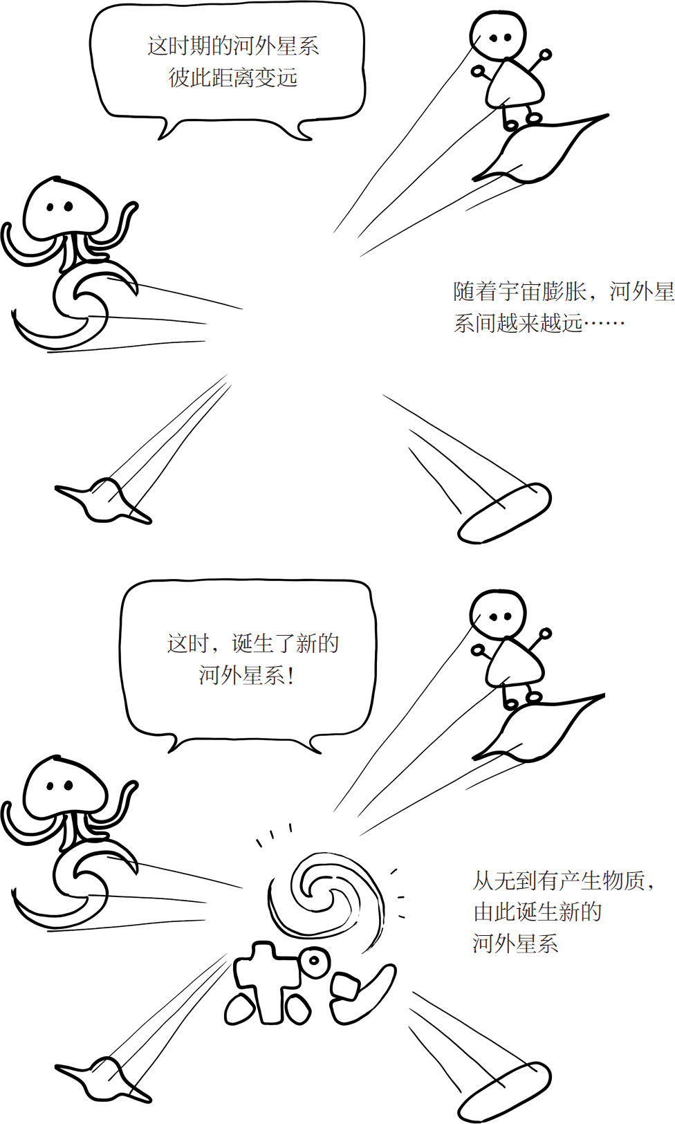 但在稳恒态理论中,即使膨胀,宇宙密度也不会降低,因为真空中会涌现新的物质。从空无一物中不停地出现物质就是这个宇宙模式的本质(图4-5)。