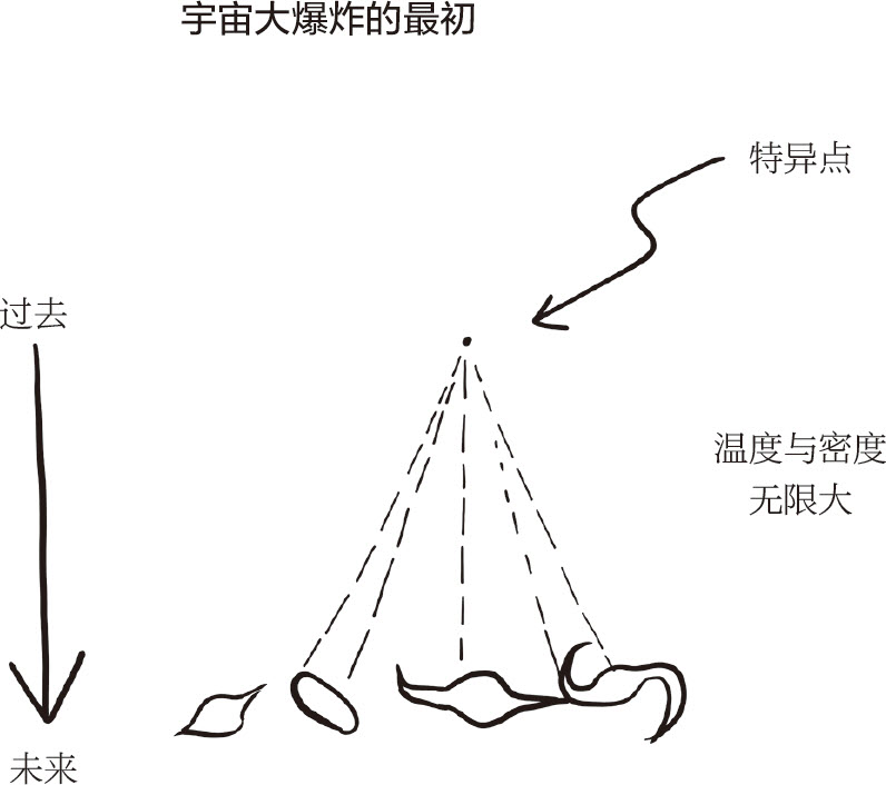 按计算,就在开始的那一瞬间,温度、密度和时空扭曲都会变得无限大,这也是特异点(图6-2)。