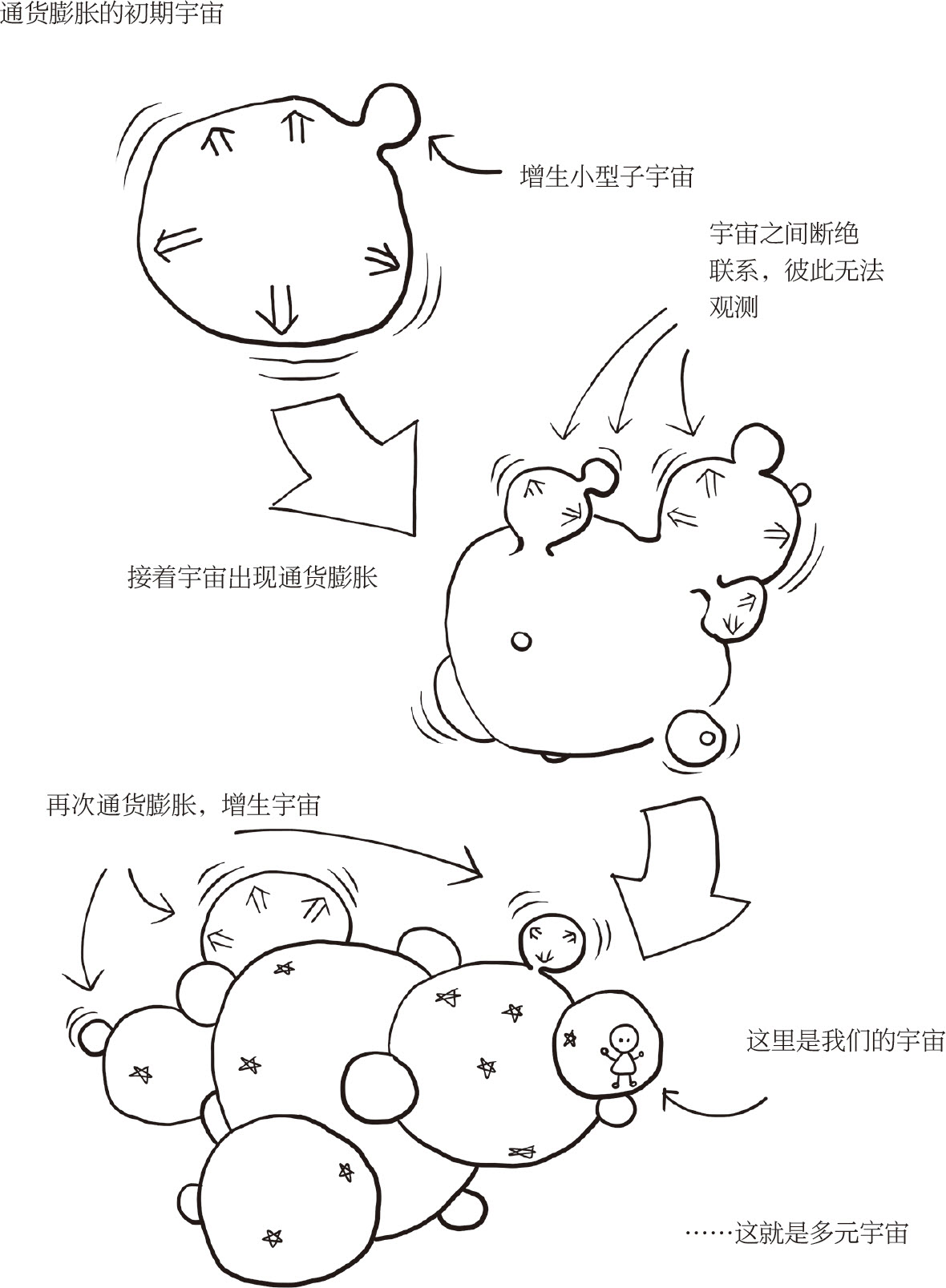 观测远方河外星系会发现它与通货膨胀理论的预想一致,因此该理论被认为在一定程度上是正确的。然而通货膨胀理论(的一部分理论家)却提出了令人难以置信的结论,即通货膨胀期间,宇宙像蘑菇一样不停地增生出小小的子宇宙,如图7-2所示。