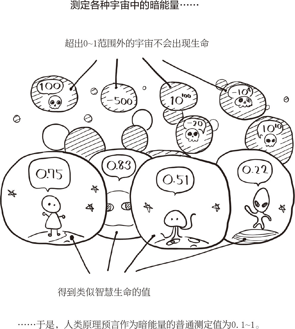 这样一来,在多元宇宙和超弦景观的无数宇宙中,测定暗能量的生命有80%的概率得到0.1~1的测定值,得到0.01以下或0.001以下测定值的生命极其稀少。这就是人类原理的预言(图7-3)。