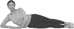 预备姿势:侧卧,右手肘部撑地,左手自然放在体前,双腿并拢,右腿微屈、左腿伸直(图6-8)。