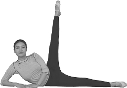 动作要领:侧腰肌肉收缩用力,带动左腿侧举至90°(图6-9),要求过程缓慢,脚尖勾起朝前、膝盖伸直,停留1~2秒,轻轻放下,但左腿不得触及右腿,更不能触地,重复16次;然后加快速度16次。反方向重复一遍。