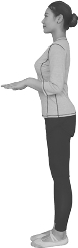 预备姿势:原地立直,双腿并拢,双手掌心向下,抬起置于腰部两侧,使小臂与身体呈90°,肘关节夹紧身体(图6-12)。