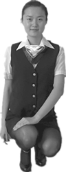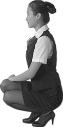 ✧双膝并拢、后脚尖靠在另一脚的脚弓(脚的1/2)处,轻缓下蹲,与男士要求相同,但双膝必须并拢,上身直立(图7-12);
