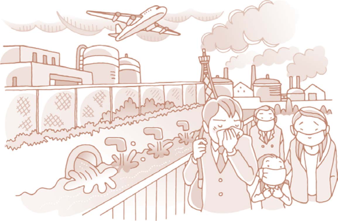 工厂、轮船、飞机等排出的尾气中含有氧化硫、煤烟、镉、氯气、粉尘等。每年3—5月时大气中会含有高浓度的PM2.5,这些是粒子非常小的大气污染物质,会对呼吸系统和健康造成影响。