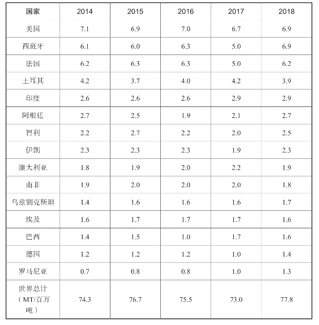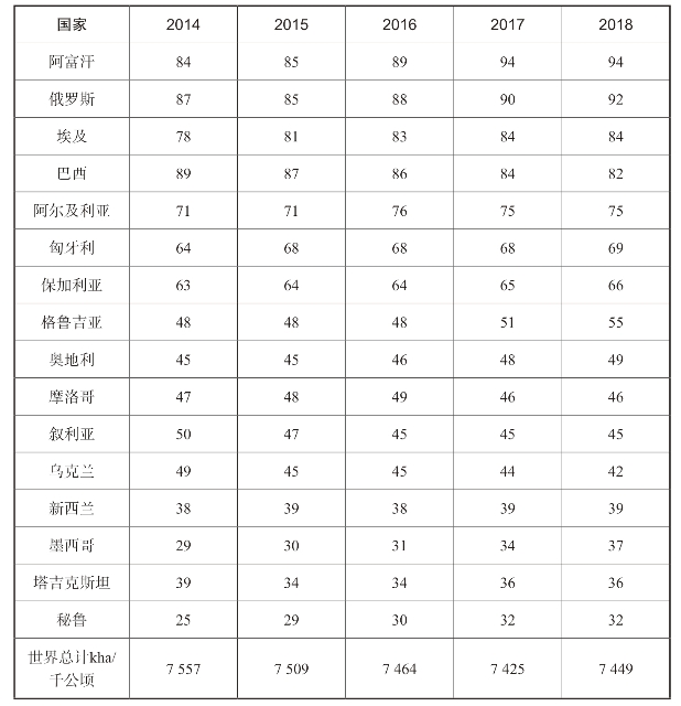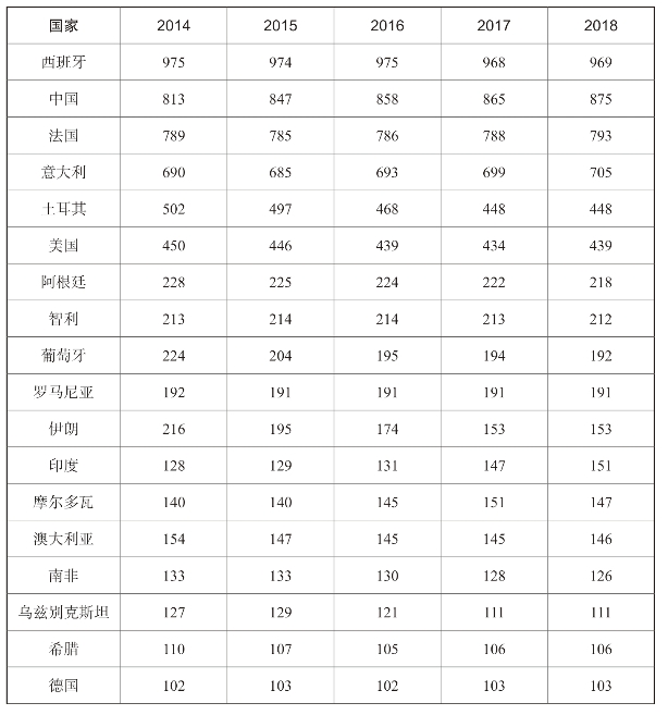 相对于欧洲葡萄酒生产国狭小的国土面积,中国丰富多样的地理环境、地貌特征与气候环境决定了国内葡萄酒产区“风土”的多样性远大于欧洲国家,近几年,发展势头强劲。2000年以来,虽然世界范围内葡萄的种植总面积在持续减少,但新世界国家的种植面积却在持续增长,而在新世界国家中,中国的种植面积又是增长最快的。2018年,我国的葡萄种植面积达875kha,仅次于西班牙(969kha),位于世界第二位(见表1.1)。与此同时,我国是世界十大葡萄酒生产国,并且葡萄产量长期以来高居世界第一(见表1.2)。可以说,中国葡萄酒业的蓬勃发展为葡萄酒旅游活动的开展奠定了产业基础。