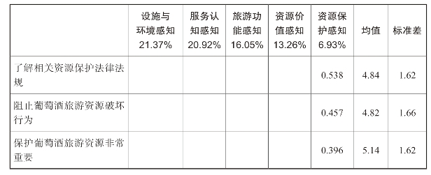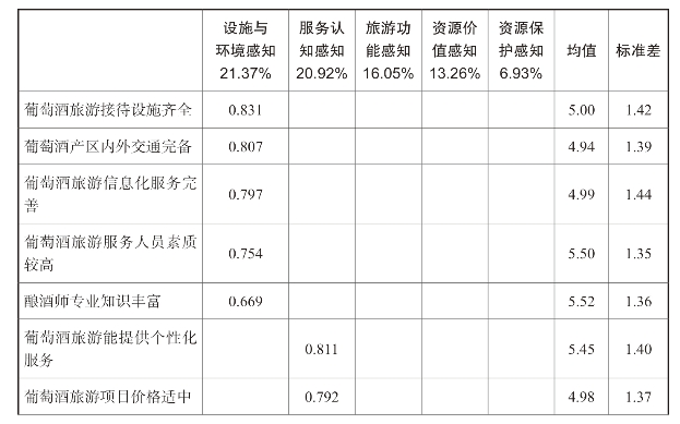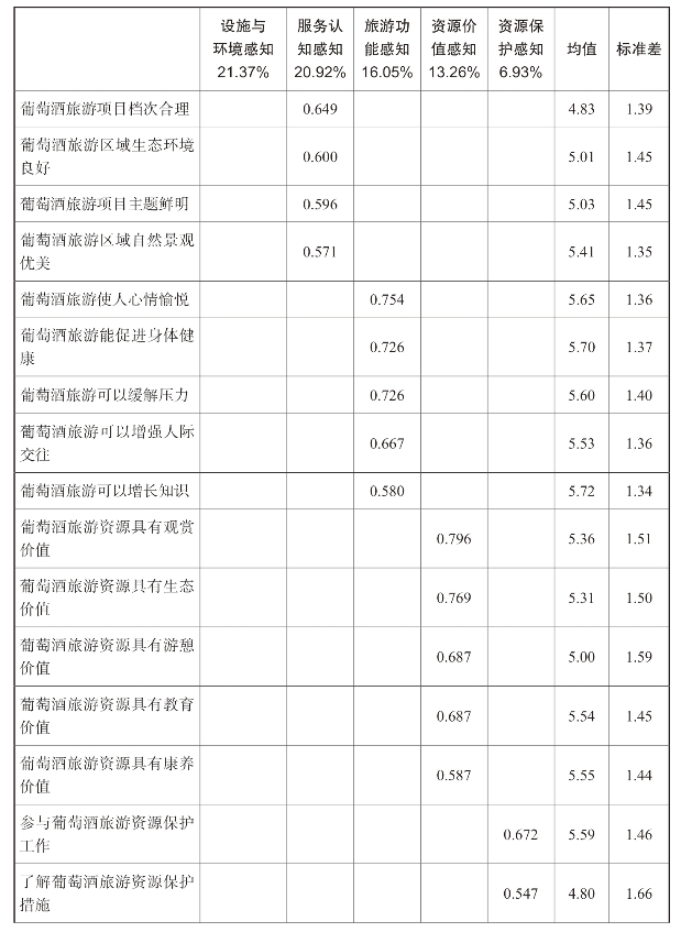 其中,第一公因子为设施与环境感知(X1、X2、X3、X4、X5)、第二公因子为服务认知感知(X6、X7、X8、X9、X10、X11)、第三公因子为旅游功能认知(X12、X13、X14、X15、X16)、第四公因子为资源价值感知(X17、X18、X19、X20、X21)、第五公因子为资源保护感知(X22、X23、X24、X25、X26)。此外,为反映游客对于葡萄酒旅游的支持度和支付意愿,设置支持度(X27、X28、X29、X30、X31)和支付意愿(X32、X33、X34、X35)。