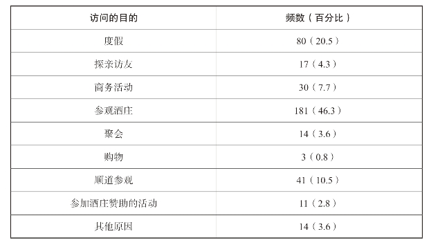 通过旅游者“访问的主要目的”,可以看出,“酒庄参观”以46.3%,排名第一,说明酒庄最具吸引力,的确是葡萄酒旅游的核心资源。第二是“度假”,占20.5%。葡萄酒产区的环境和舒适度等对旅游者同样具有吸引力。第三是,“顺道参观”,占10.5%,从侧面反映出多数游客对葡萄酒旅游尚不了解,葡萄酒并不是此次旅行的主要目的,而是在其他旅游的基础上,顺便为之。