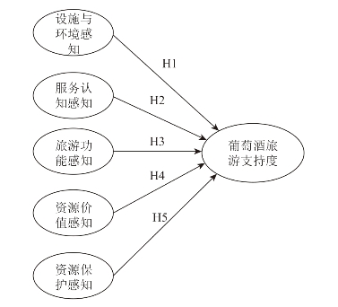 根据探索性因子分析的分析结果,构建本研究的研究模型,其中包含5个潜变量26个观测变量,其中设施与环境感知、旅游功能感知、服务认知感知、资源价值感知、资源保护感知是潜变量,葡萄酒旅游支持度是内生潜变量(内生变量的测度上含4个题项,分别为X27-支持葡萄酒旅游深度开发,X28-我乐于看到更多葡萄酒旅游项目,X29-愿意体验葡萄酒旅游项目,X30-愿意为葡萄酒旅游项目支付费用),5个潜变量影响内生变量。根据前人研究基础和以上假设推论,提出以下5个假设(图4.1):H4:资源价值感知与支持度之间存在显著正向关系;H2:服务认知感知与支持度之间存在显著正向关系;H1:设施与环境感知与支持度之间存在显著正向关系;H3:旅游功能感知与支持度之间存在显著正向关系;H5:资源保护感知与支持度之间存在显著正向关系。
