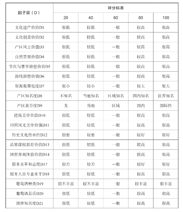 在确定葡萄酒旅游资源开发条件评价指标体系及其因子权重之后,需要对每个因子按照一定标准进行赋分。为了便于实际操作,本研究将目标层设为100分,针对每个因子的打分标准设定5个赋分级别(20,40,60,80,100),而且每个因子赋分依据均有具体说明。某区域葡萄酒旅游资源开发综合评价分值的计算公式为: