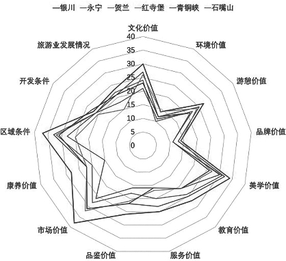 (2)将指标层赋值数据录入Excel,画出半径为0、5、10、15……的8个同心圆,从圆心出发的所有距离都代表每个指标的得分;再把圆分成13个扇形区,分别代表指标层的13个指标。最后,依次在坐标轴上标出各指标的实际得分,用线段连接这9个点,形成了多边形折线闭环,得到六个子产区的指标层赋值叠加的雷达图(图6.5),可以看到银川产区的覆盖面积最大,13个指标几乎全部领先于其他5个产区,尤其是在市场价值和区域条件方面更是遥遥领先,确实符合良好级别的标准。永宁产区相对银川产区的覆盖面积较小,虽然同样达到良好级别,但在市场价值和区域条件等方面需要进一步提升。其他四个普通级的产区,在不同方面各有千秋,比如:红寺堡产区的市场价值甚至超过排名第二的永宁产区,说明其葡萄酒质量、产区知名度等较高,但在区域条件和旅游业发展程度方面,却远不及其他产区,今后要加强与旅游业的结合度,提升产区的开发条件。