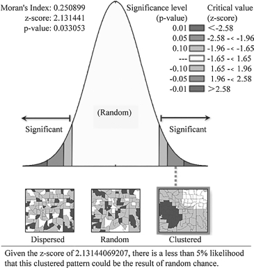 通过计算贺兰山东麓葡萄酒酒庄数量的全局Moran's I指数,分析它们的分布是否集聚于某一区域(市、县)内。全局指标用于检测所有研究区域的空间分布特征,它以单一的值反映研究区的自相关程度。Moran's I指数的值域为[-1,1],当取值为1时,表示完全正相关;当取值为-1时,表示完全负相关;当取值为0时,表示不相关。计算结果得到Moran's I指数为0.14,z得分为2.16,p值为0.03,通过1%显著水平检验(如图6.14、图6.15)。表明贺兰山东麓产区的旅游资源在全局中呈现空间集聚特征。